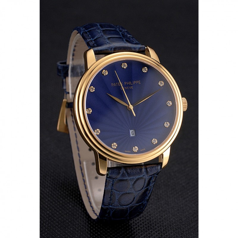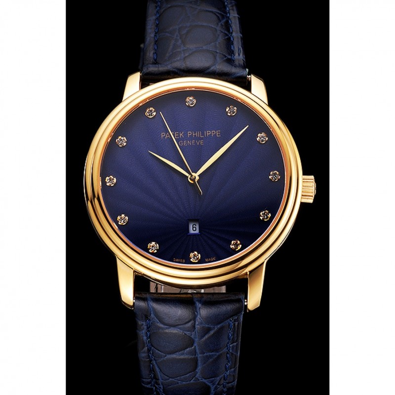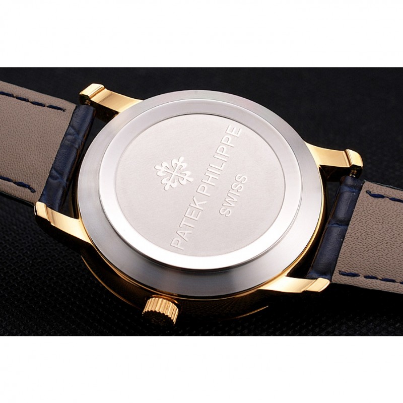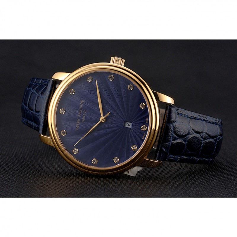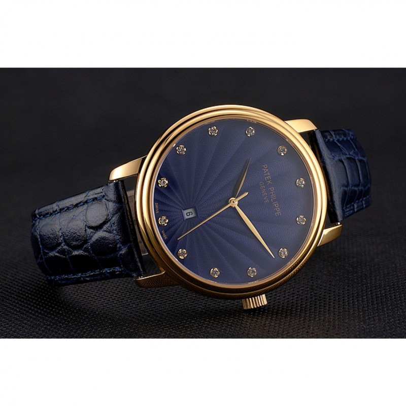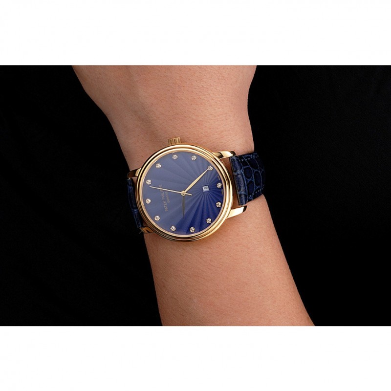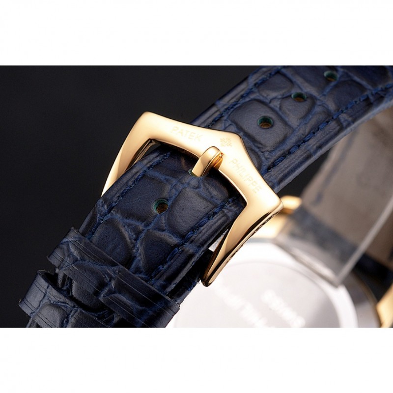 Gama alta Patek Philippe Fecha azul Guilloche Dial correa de cuero de la caja del oro azul