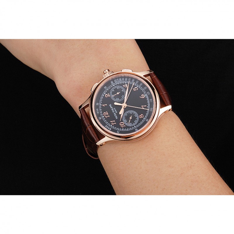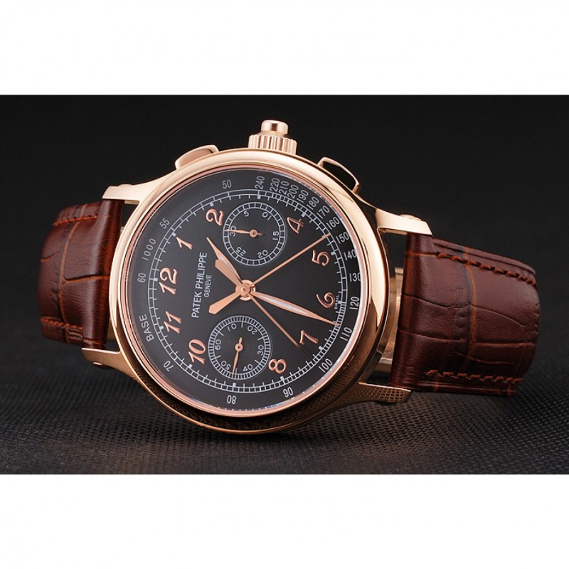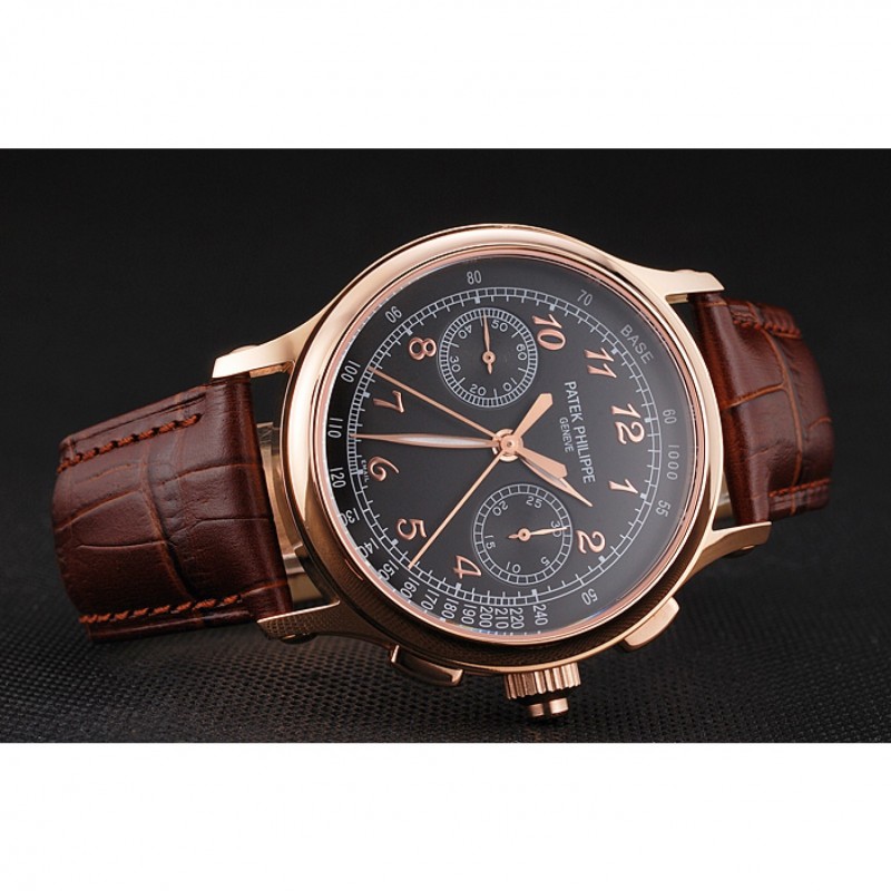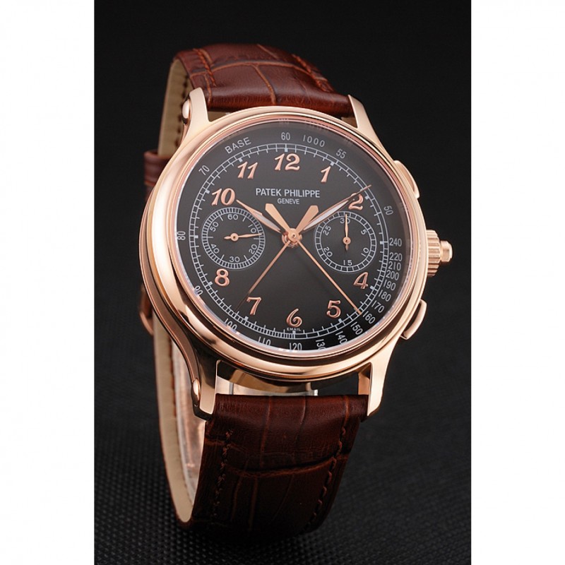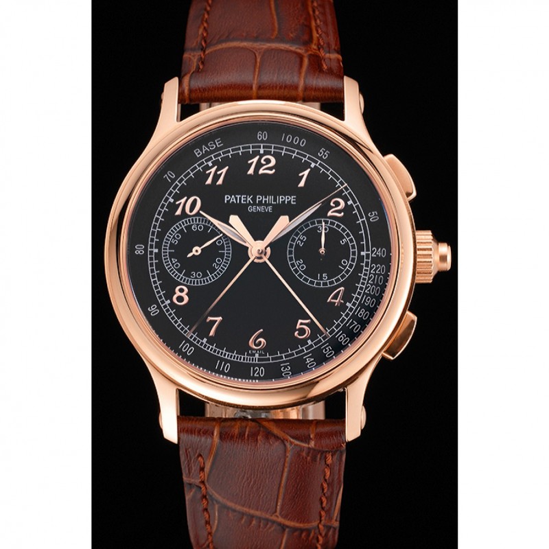 Gama alta Segundos suizo Patek Philippe Dividir Cronógrafo Negro Dial correa de cuero de la caja de oro rosa Brown