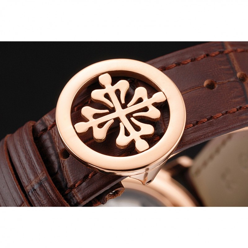 pulsera: logotipo y correa de piel de cocodrilo marrón en relieve de calor Patek Philippe con el logotipo de Patek Philippe 18k tallado de oro rosa plateado gancho hebilla de cierre
