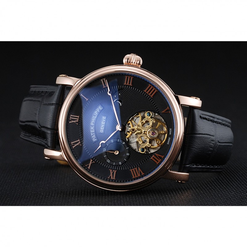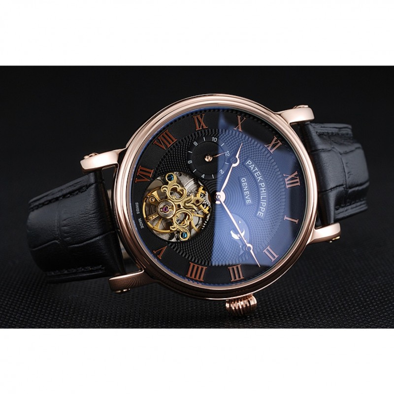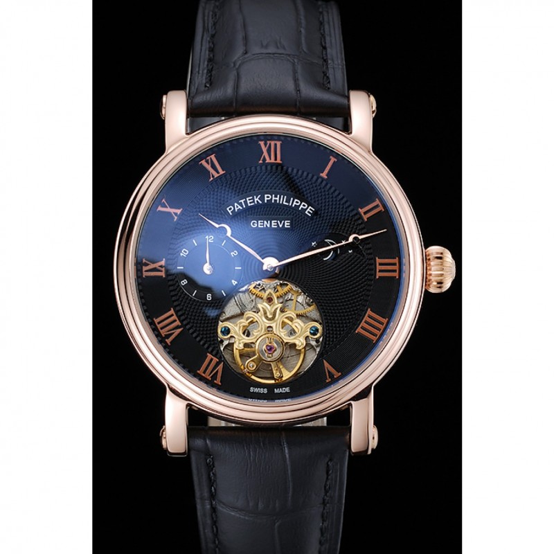 Las complicaciones Fase lunar Patek Philippe Tourbillon Negro Dial correa de cuero de la caja de oro rosa Negro