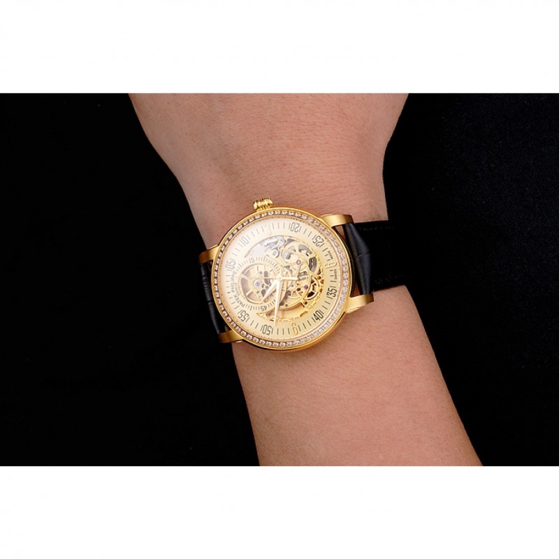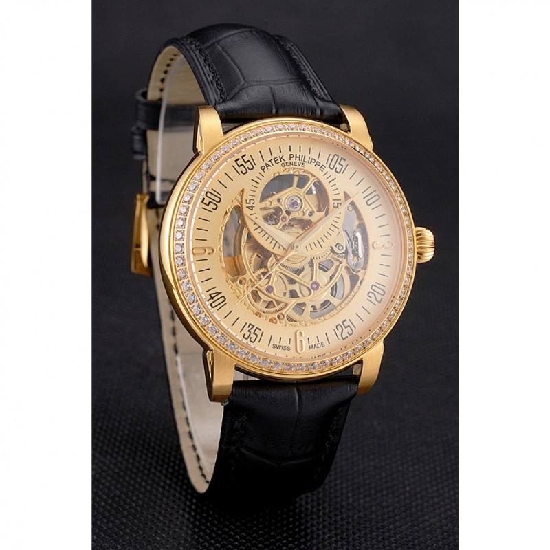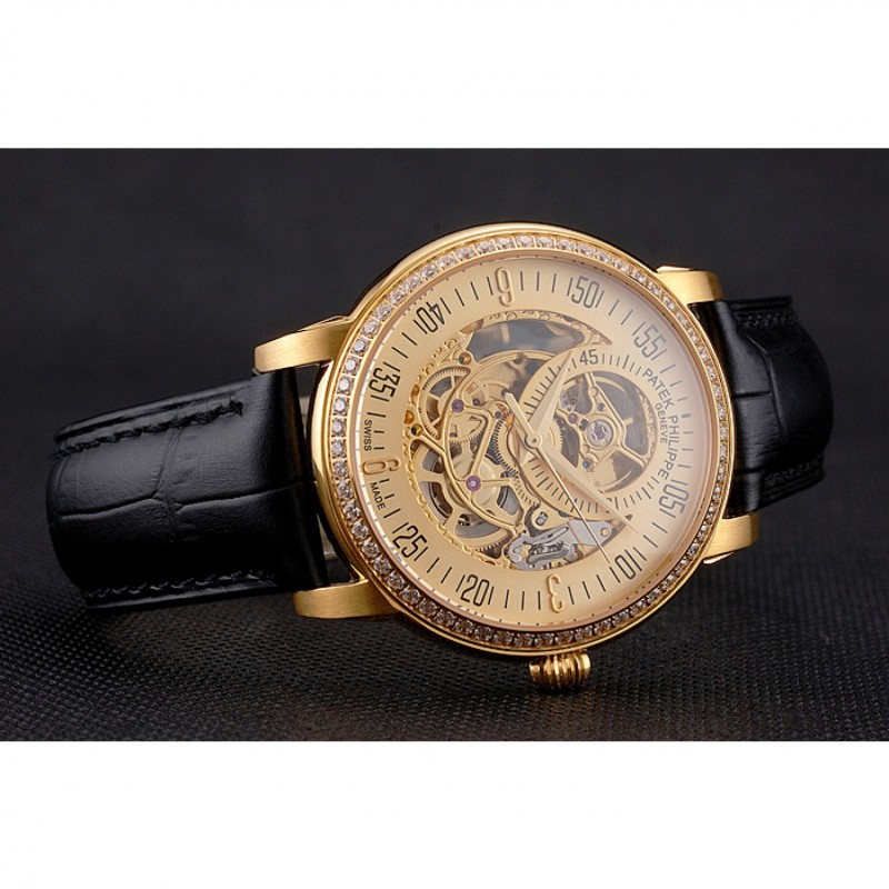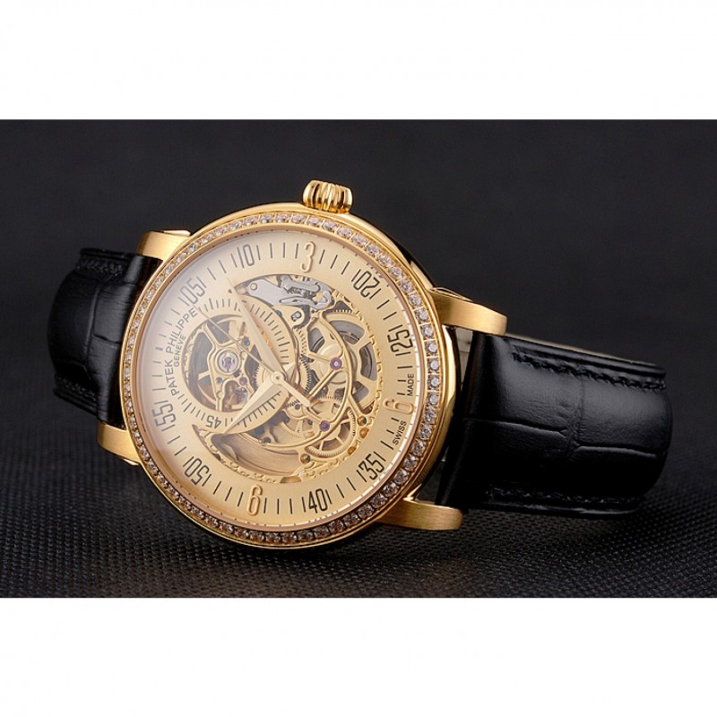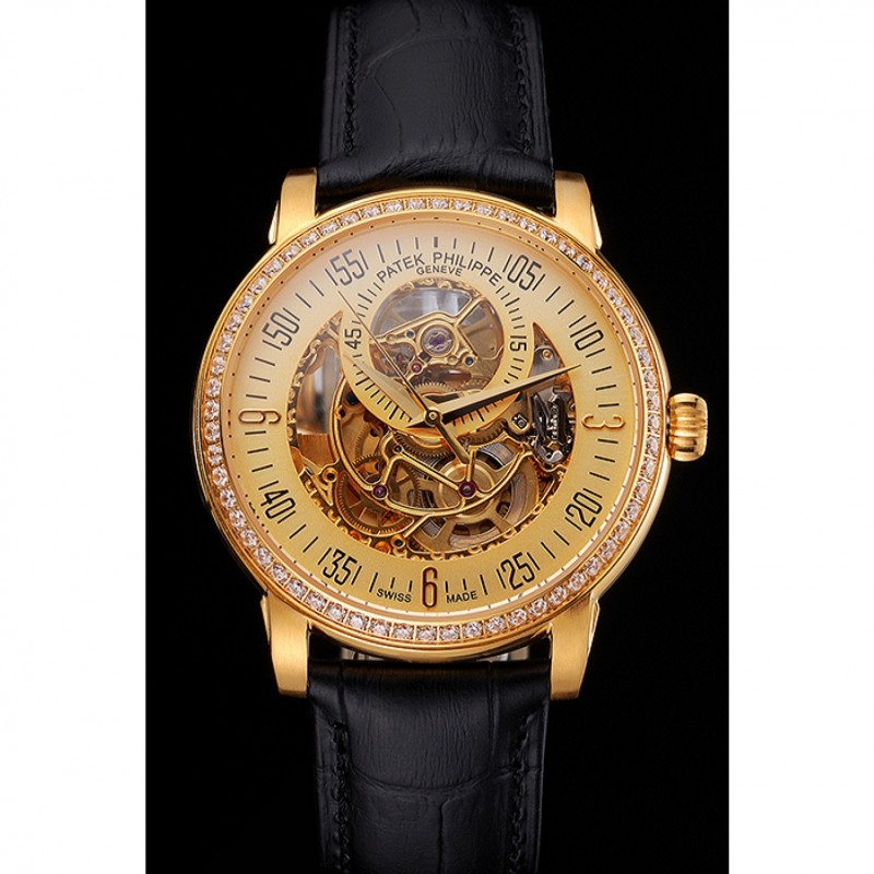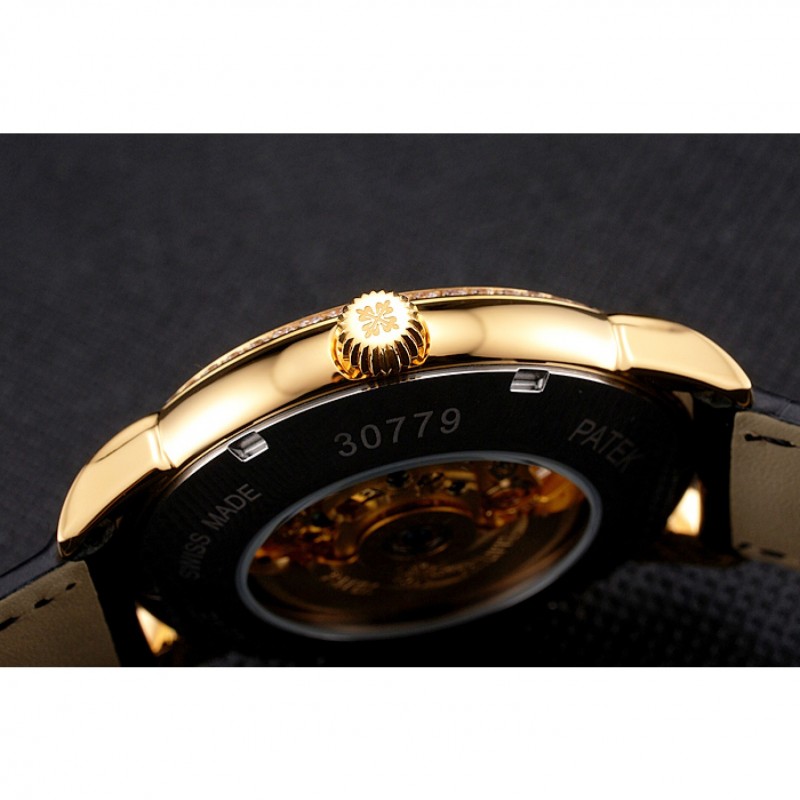 Las complicaciones suizo Patek Philippe calada Dial correa de cuero Bisel De Oro Diamante Negro