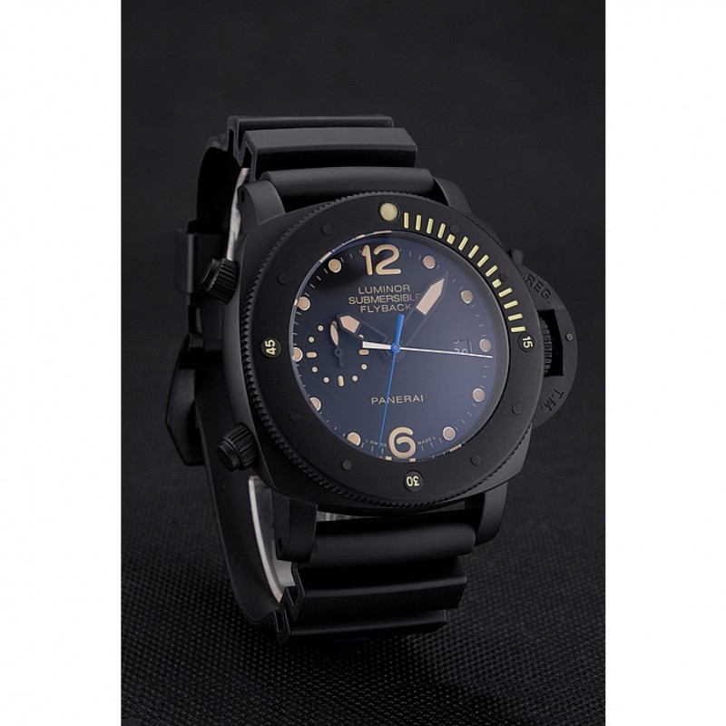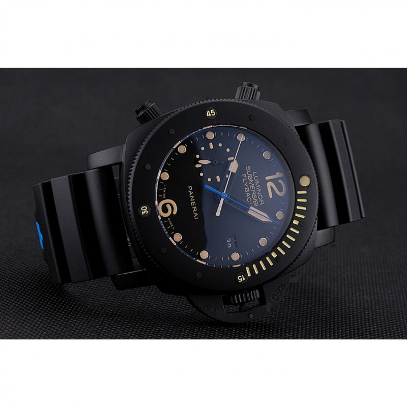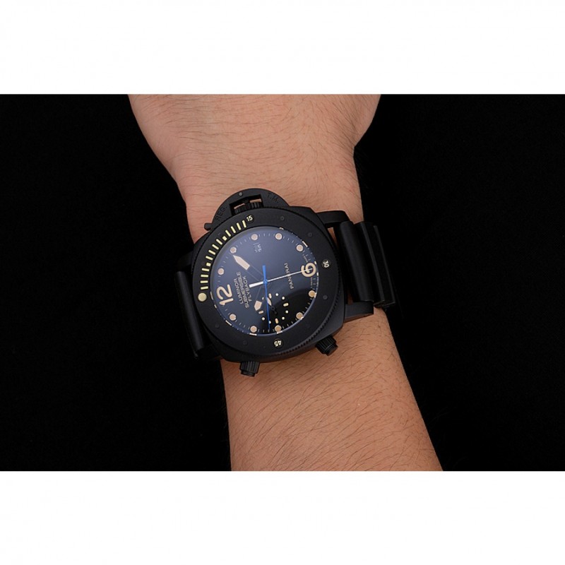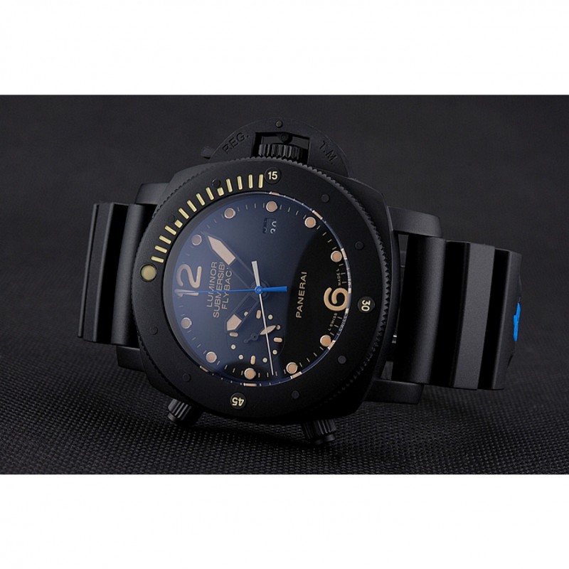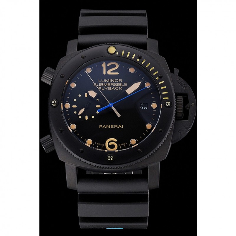 Lujo Panerai Luminor sumergibles Flyback Fecha Negro Dial Amarillo Negro Marcas ionizada caja de la correa de caucho Negro