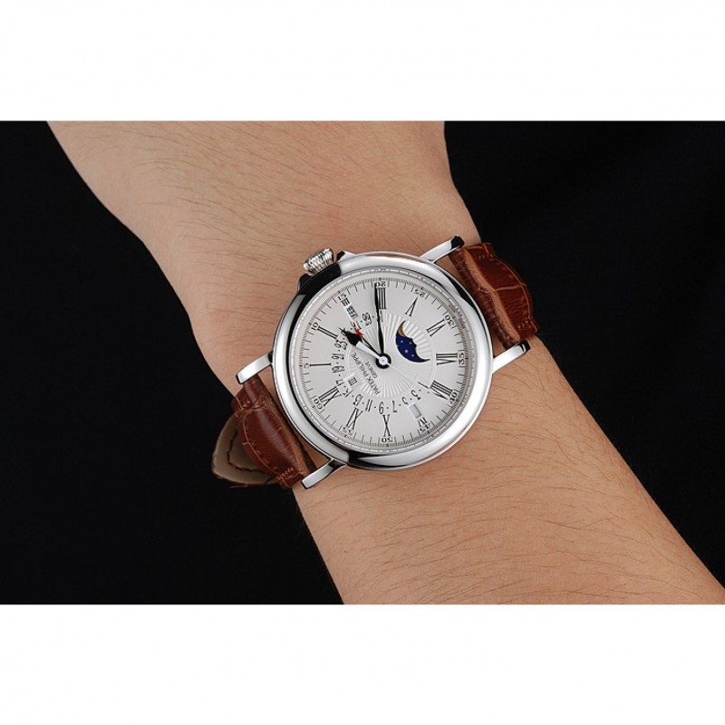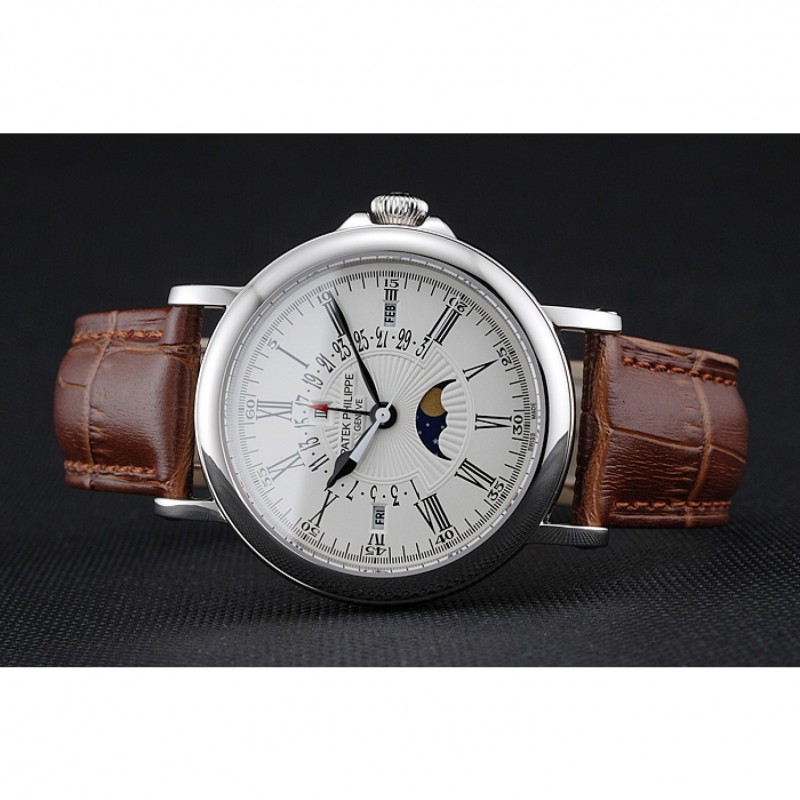 Lujo Réplicas Relojes Patek Philippe Calendario Perpetuo retrógrada Fecha esfera blanca de plata del caso Brown pulsera de cuero 1454149