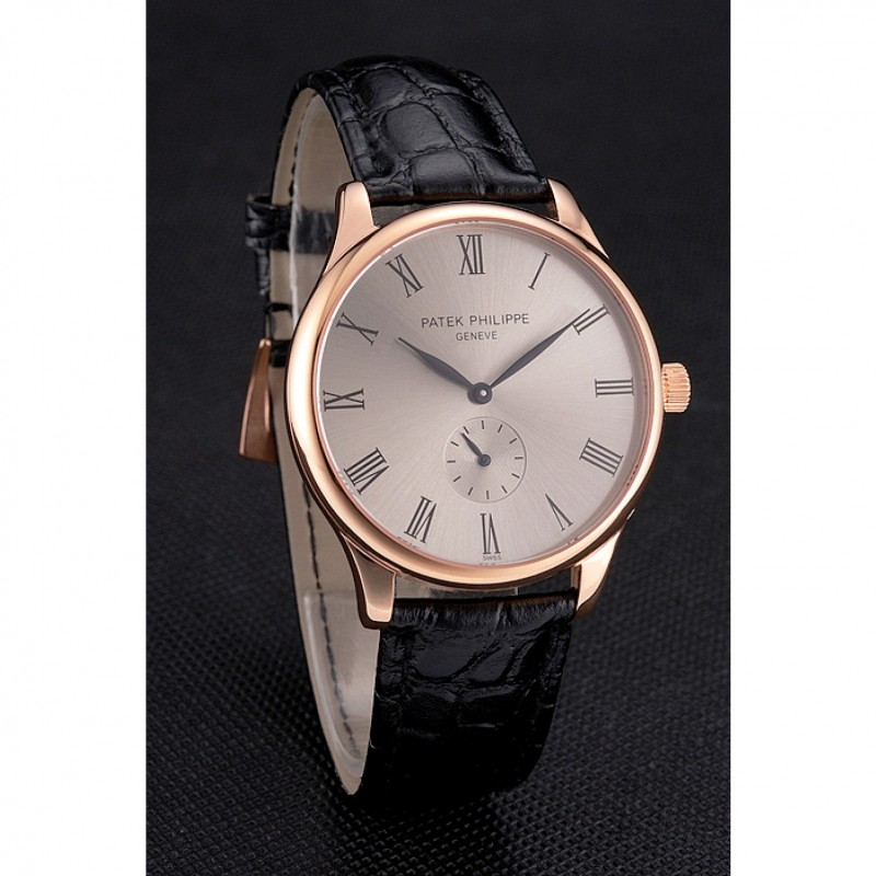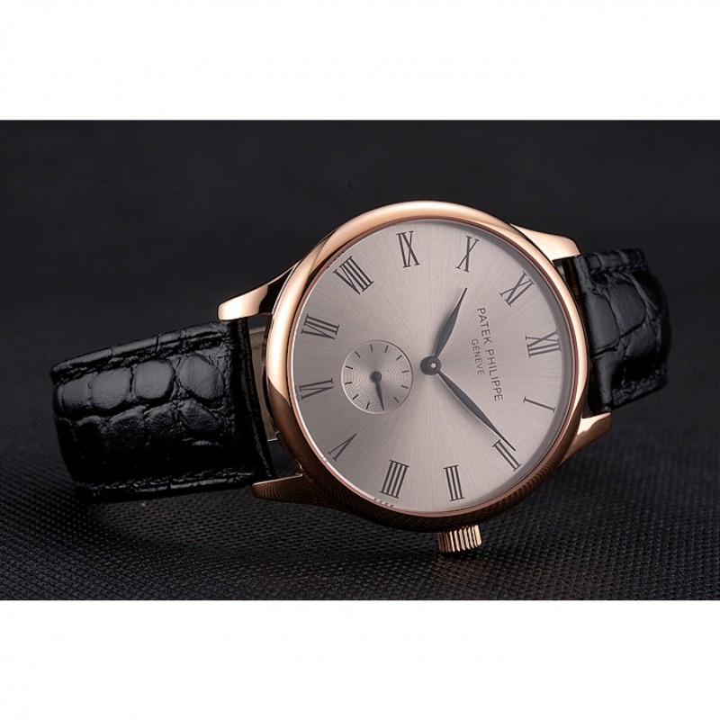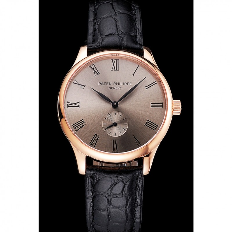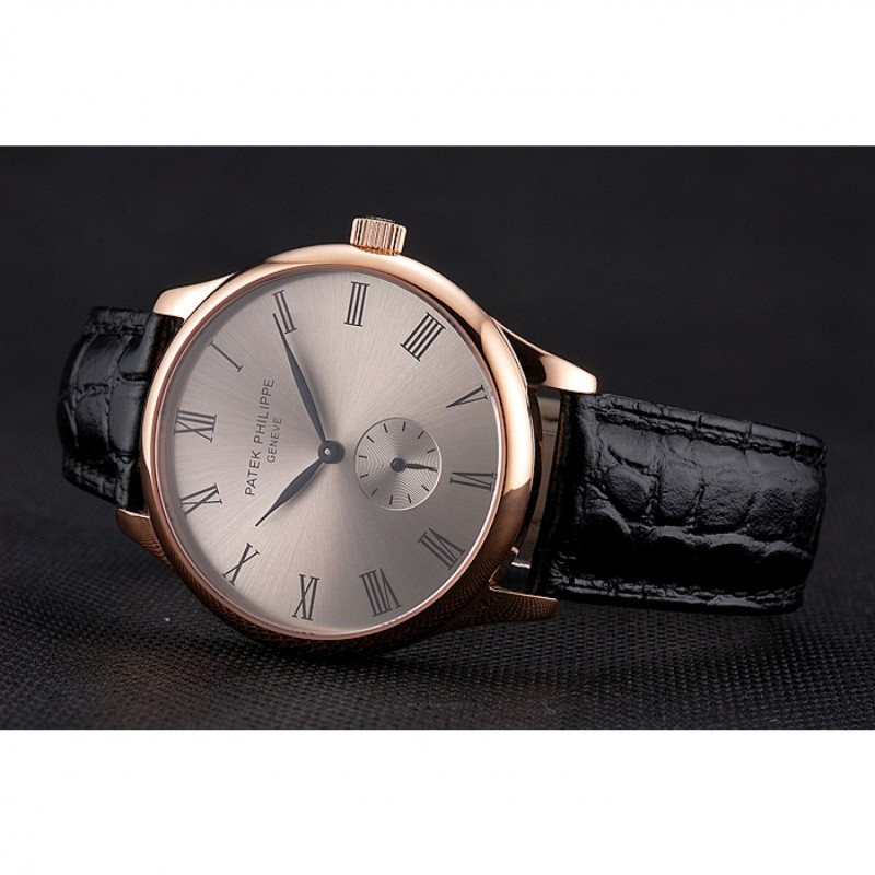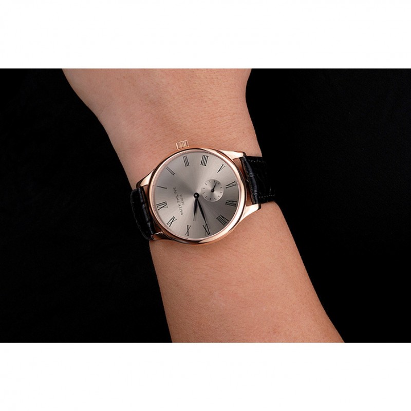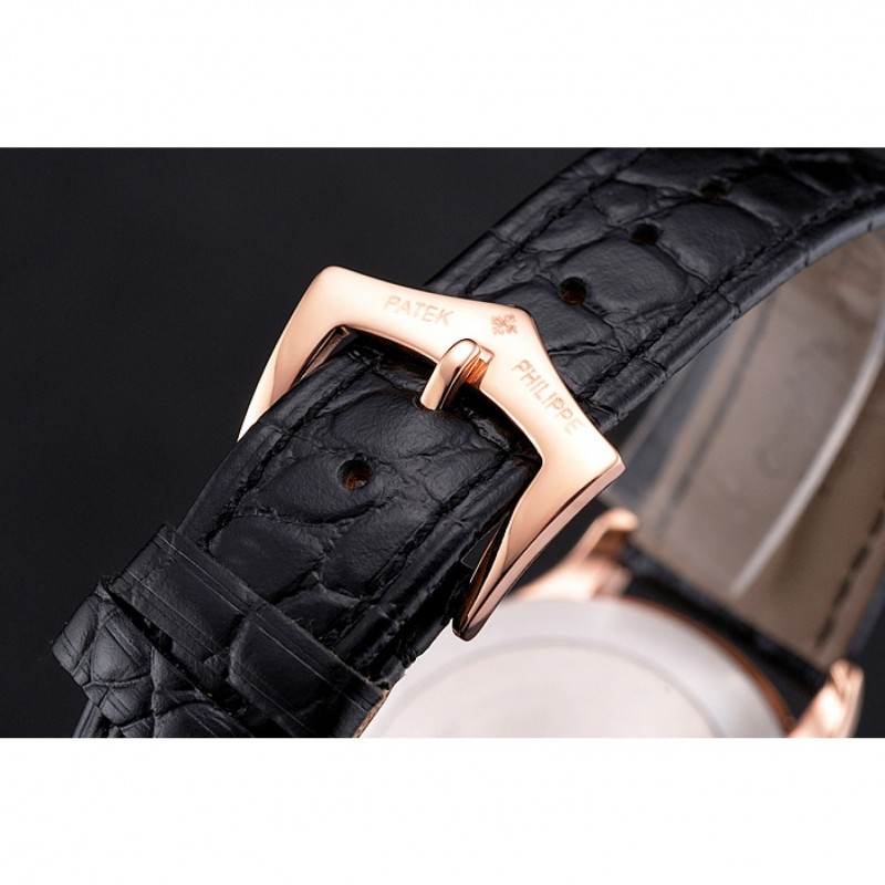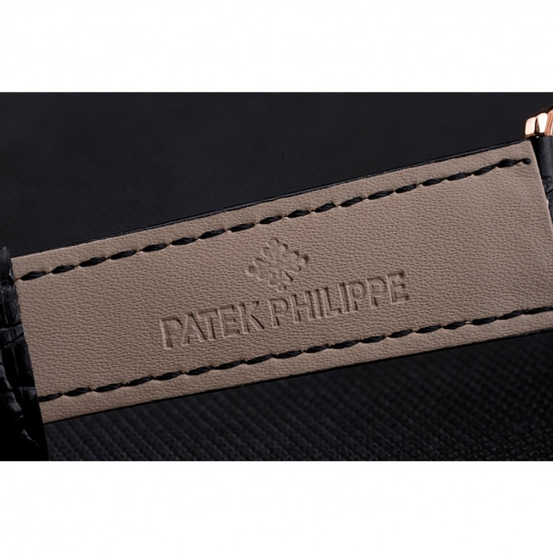 Lujo Réplicas Relojes Patek Philippe Gris Dial correa de cuero de la caja de oro rosa Negro