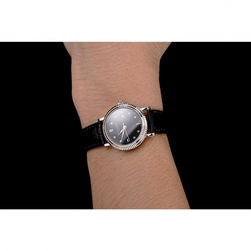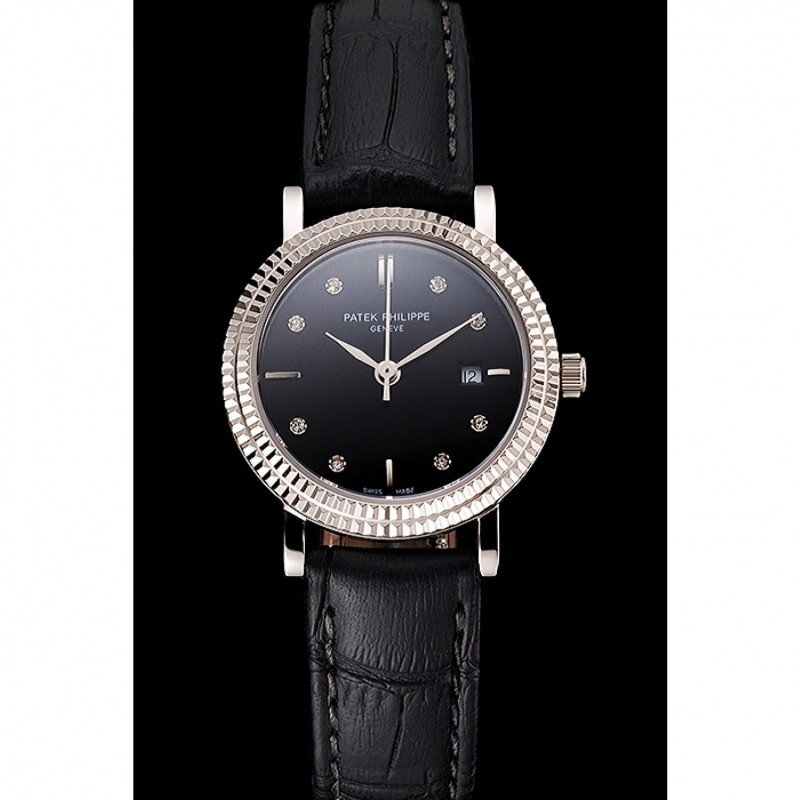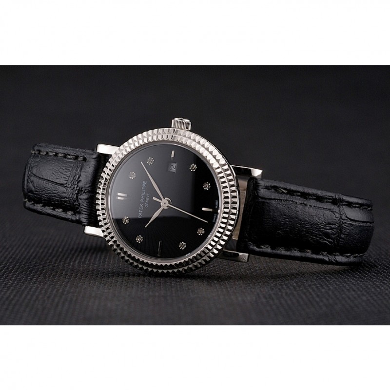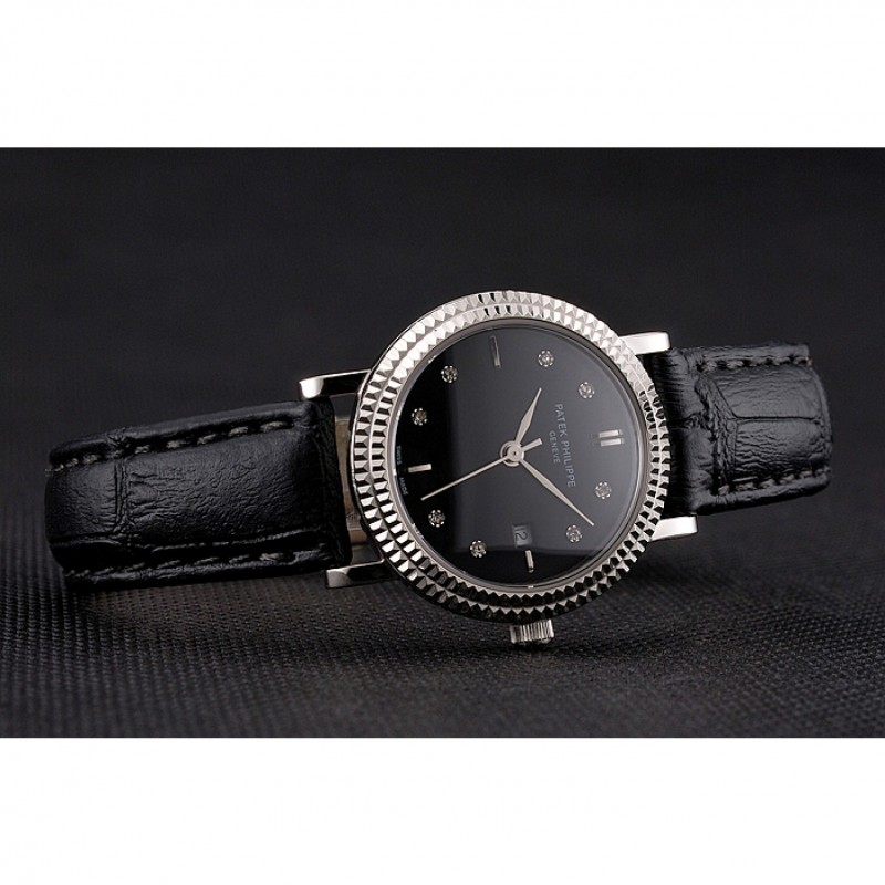 Lujo Réplicas Relojes Patek Philippe Negro Dial correa de cuero del diamante marcas de la hora doble bisel acanalado caja de acero inoxidable Negro