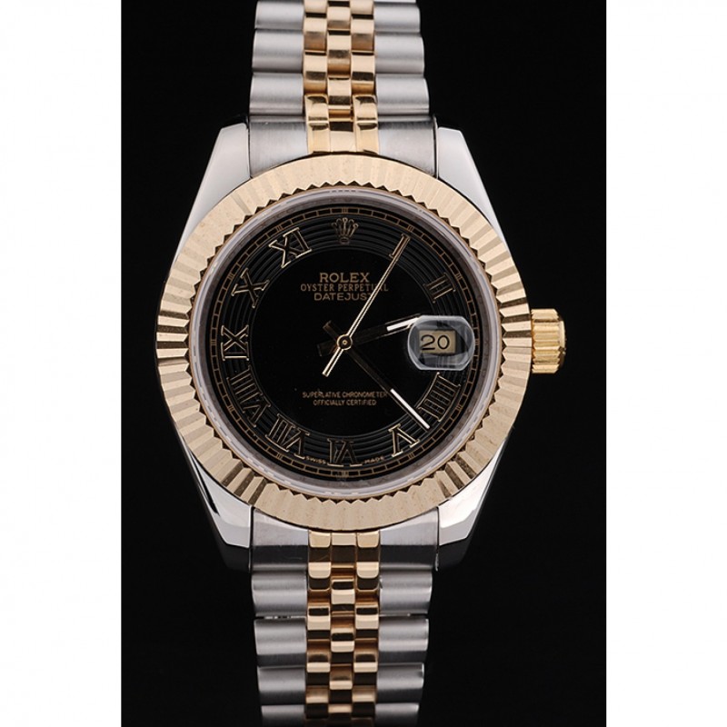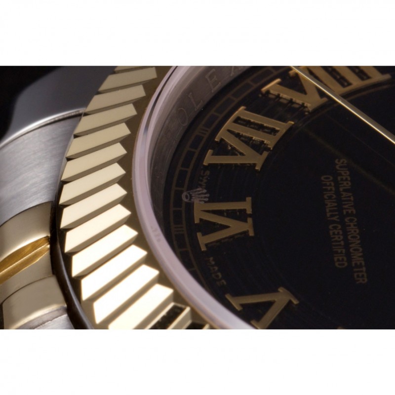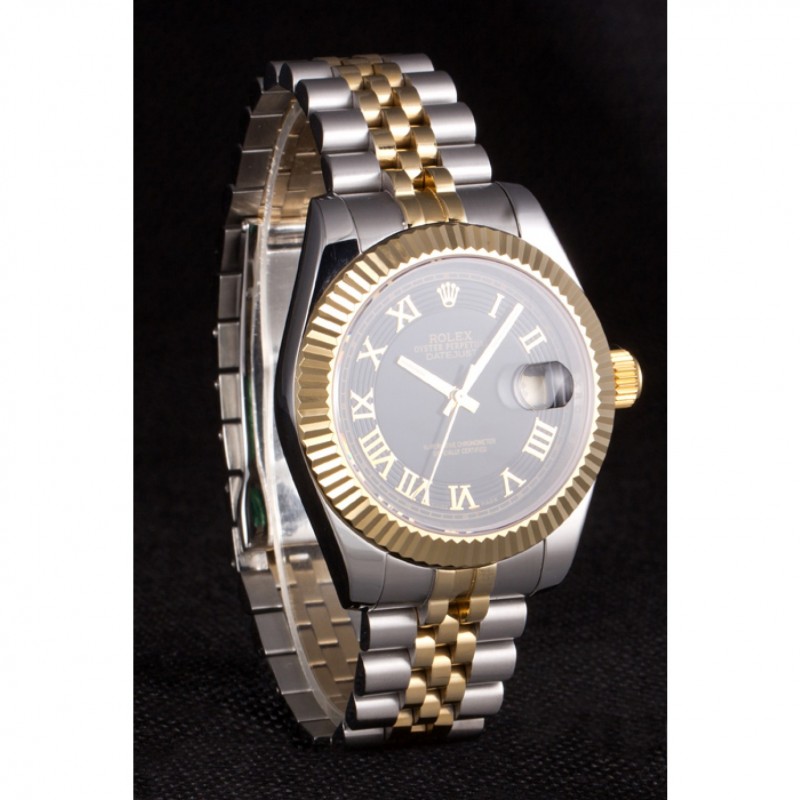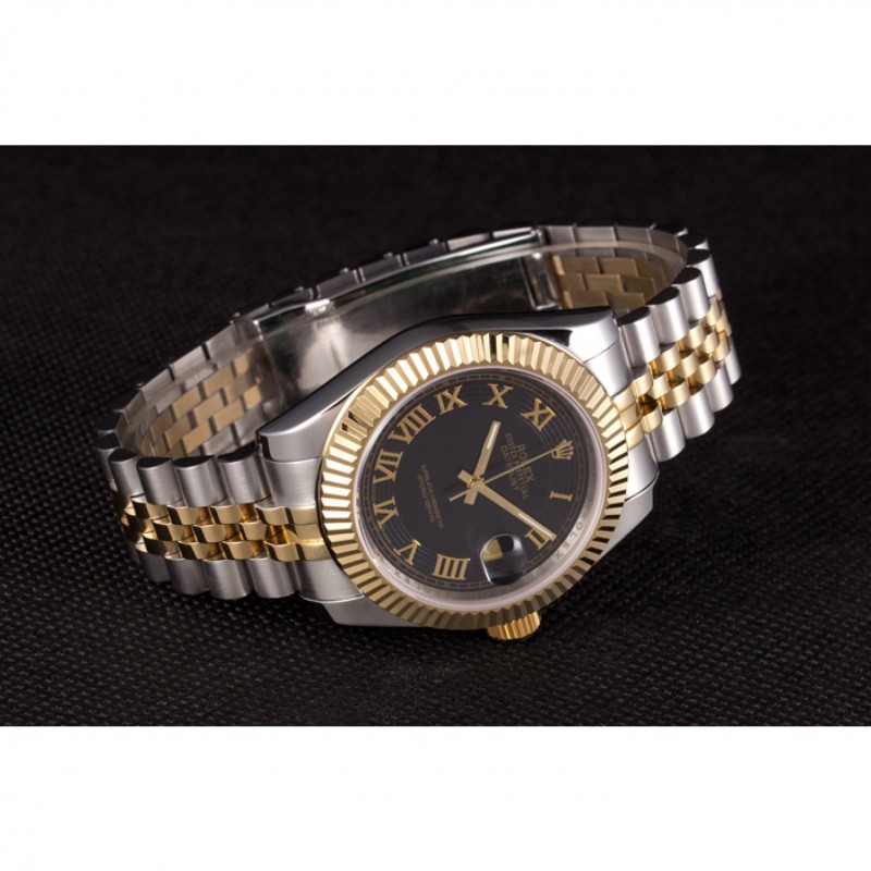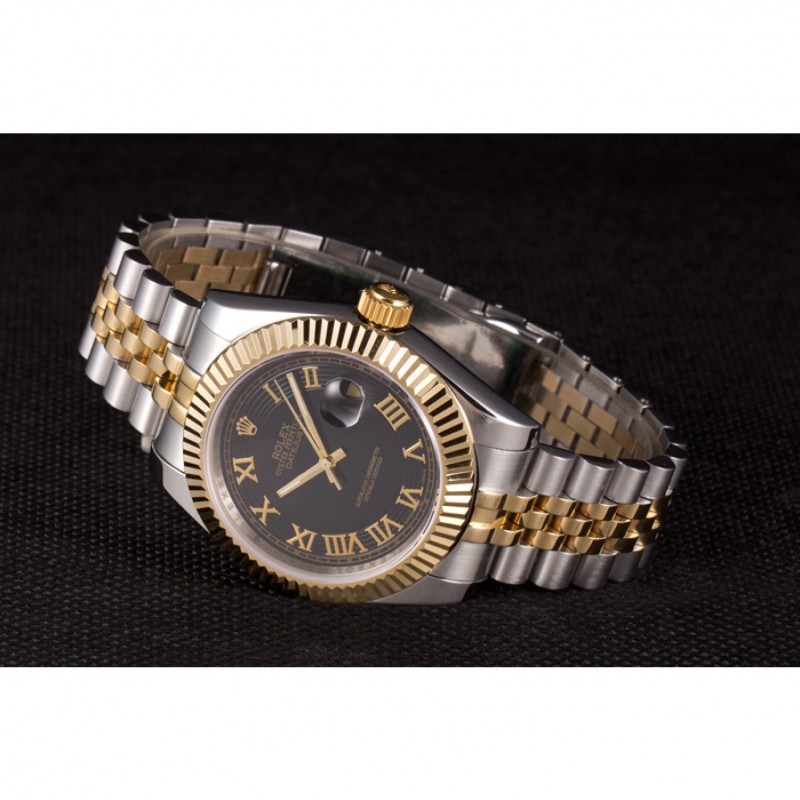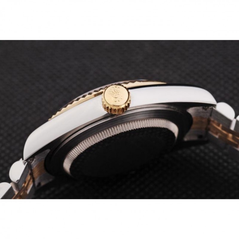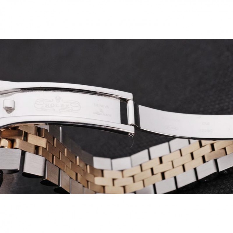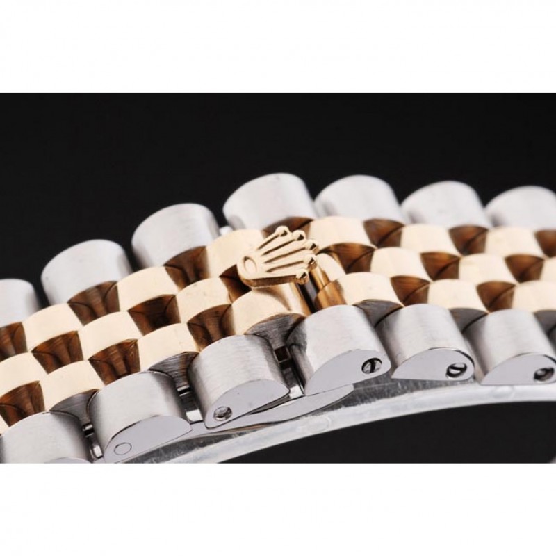 pulsera: cepillado de acero inoxidable y amarillo cadena de eslabones de oro con el doblez sobre el corchete y Rolex corona grabado