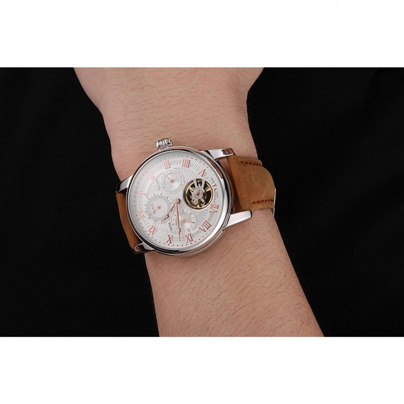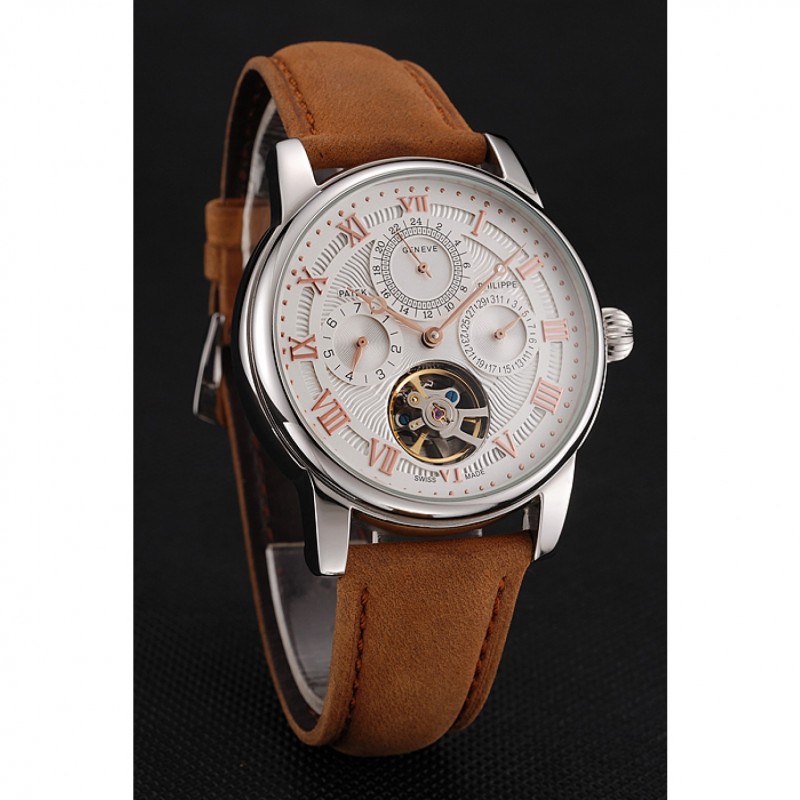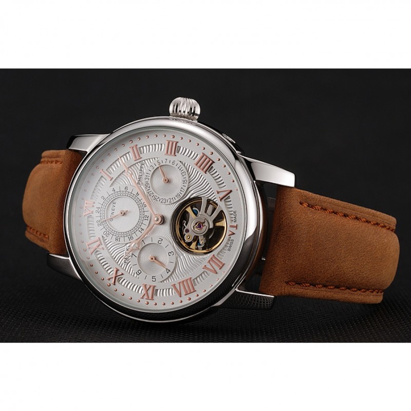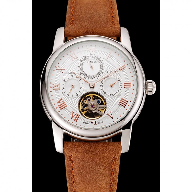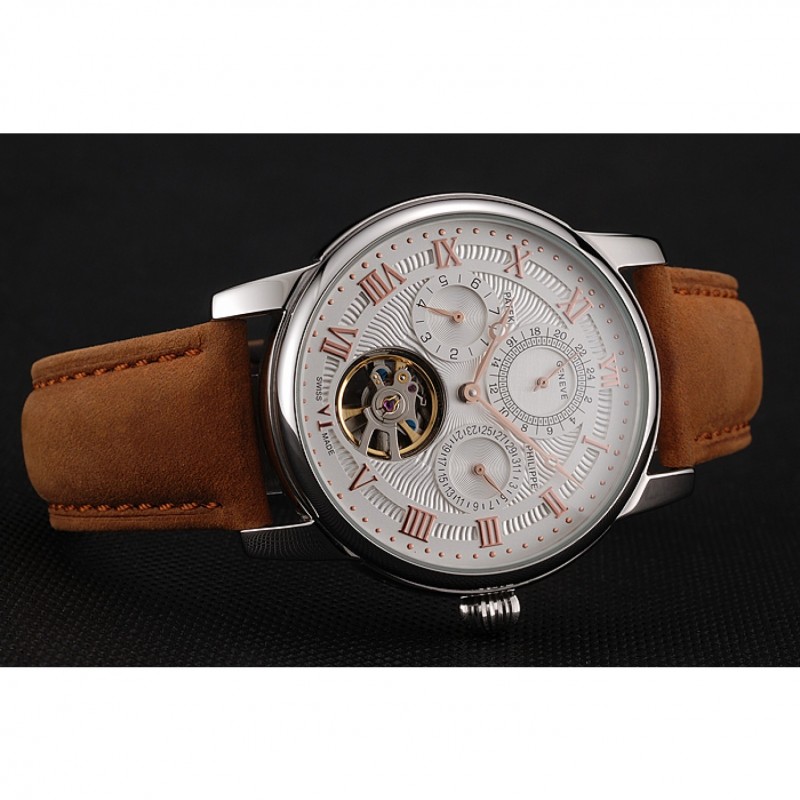Mejor Patek Philippe Grand complicaciones Día Fecha Tourbillon esfera blanca numerales de oro rosa caja de acero inoxidable Gamuza marrón correa de cuero 1453818