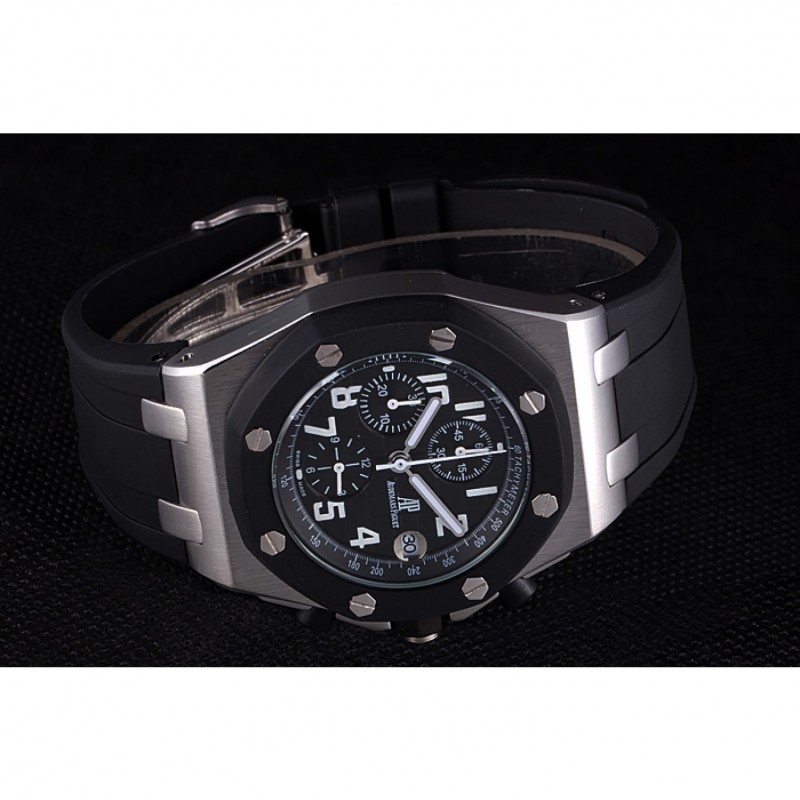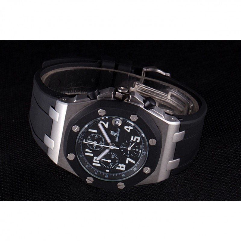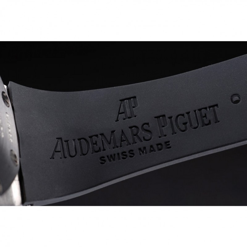 pulsera:Audemars Piguet y correa de caucho negro en relieve el logo característico con Audemar Piguet inscrito acero inoxidable cepillado plegable en el corchete
