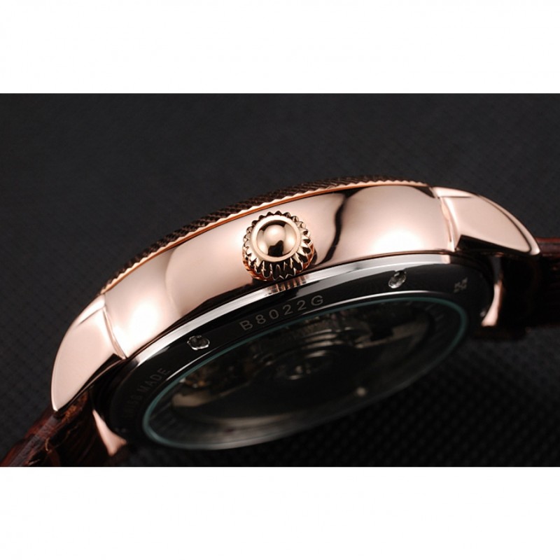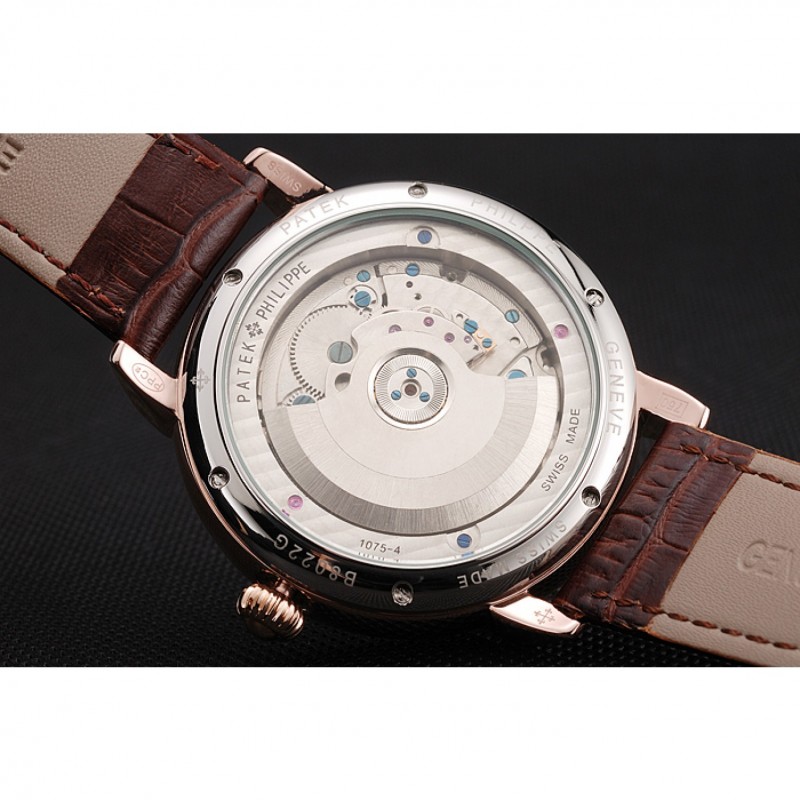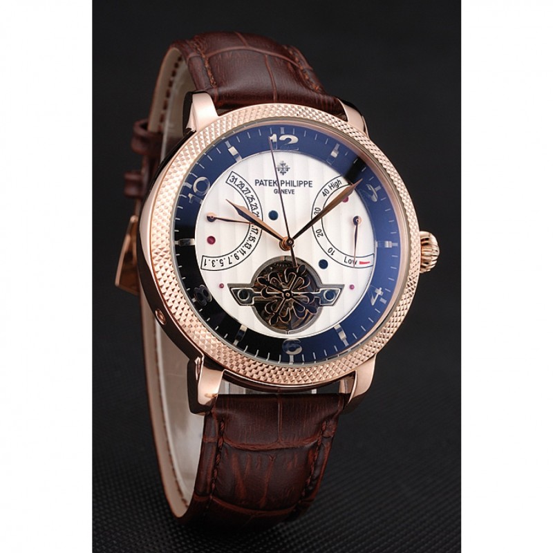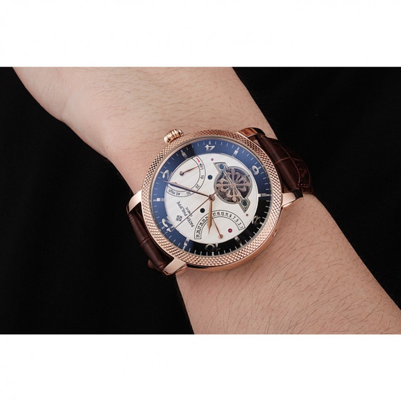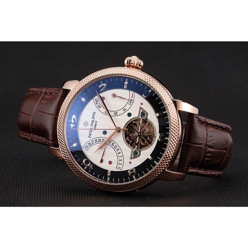 Mejor Réplicas Relojes Patek Philippe clásico Tourbillon De Reserva Blanco Y Negro Dial correa de cuero de la caja de oro rosa Brown