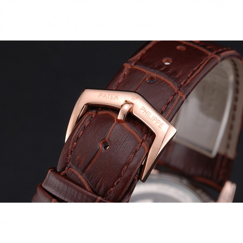 pulsera: Patek calor Philippe Geneve en relieve correa de piel de cocodrilo marrón con logotipo y Patek Philippe inscrito rosa de 18 quilates chapado en oro gancho hebilla de cierre