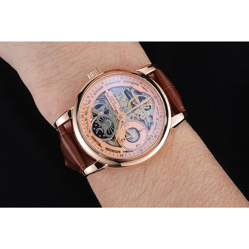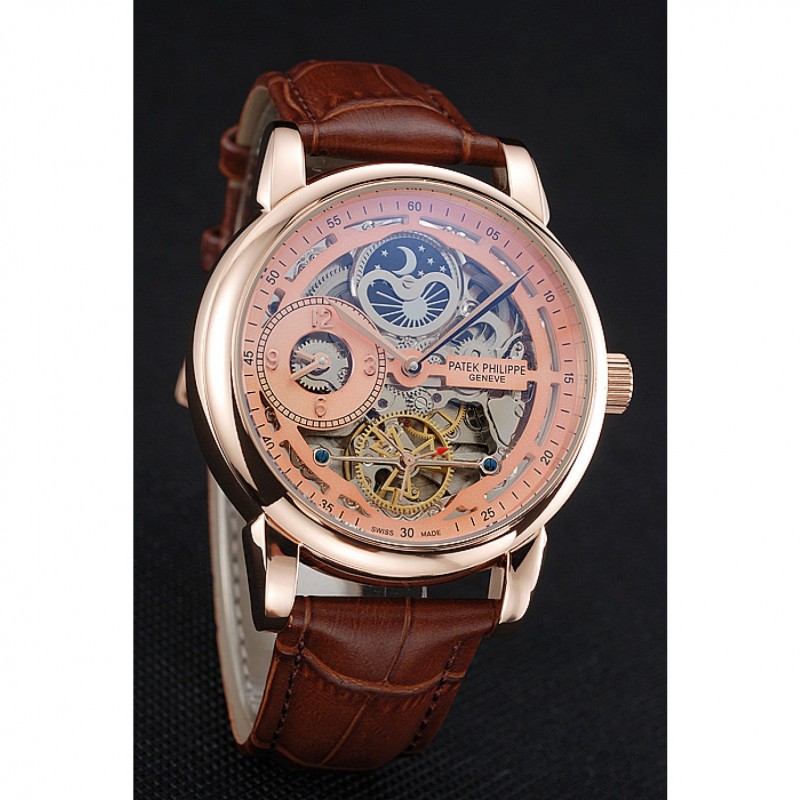 Mejor Réplicas Relojes Patek Philippe de hora dual Fase Lunar Tourbillon de Oro en esqueleto Dial correa de cuero de la caja de oro rosa Brown