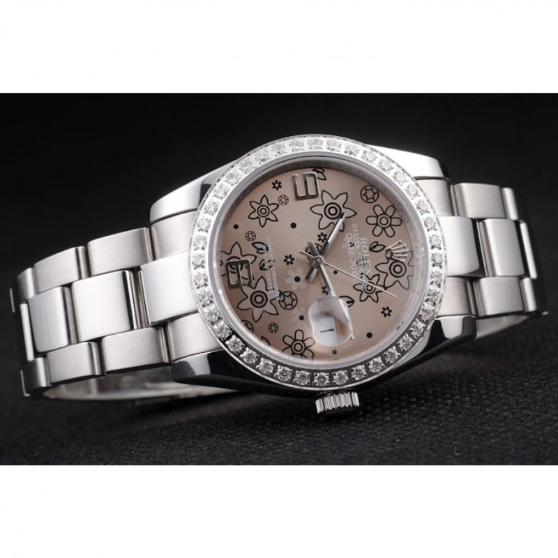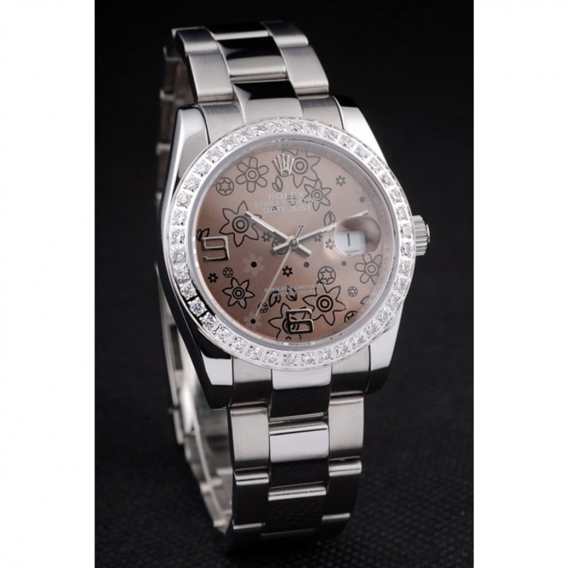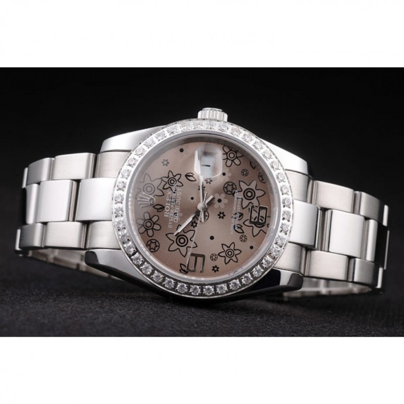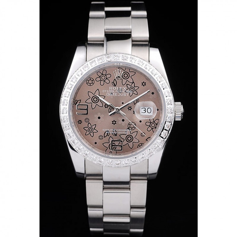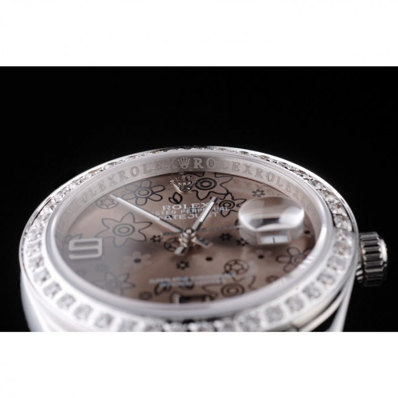 Mejor Rolex Datejust acero inoxidable pulido Flores Brown Dial Diamante plateado