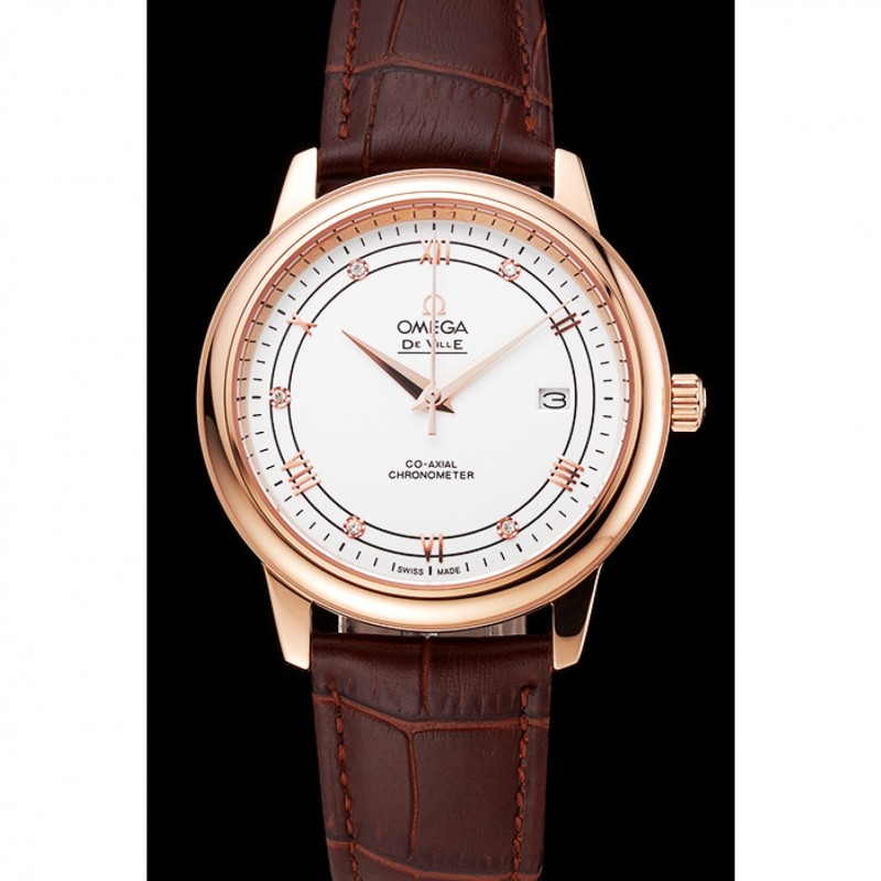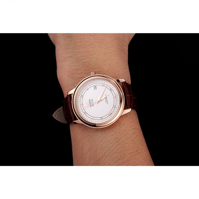 Omega De Ville Prestige Blanco Dial correa de cuero de la caja de oro rosa Brown