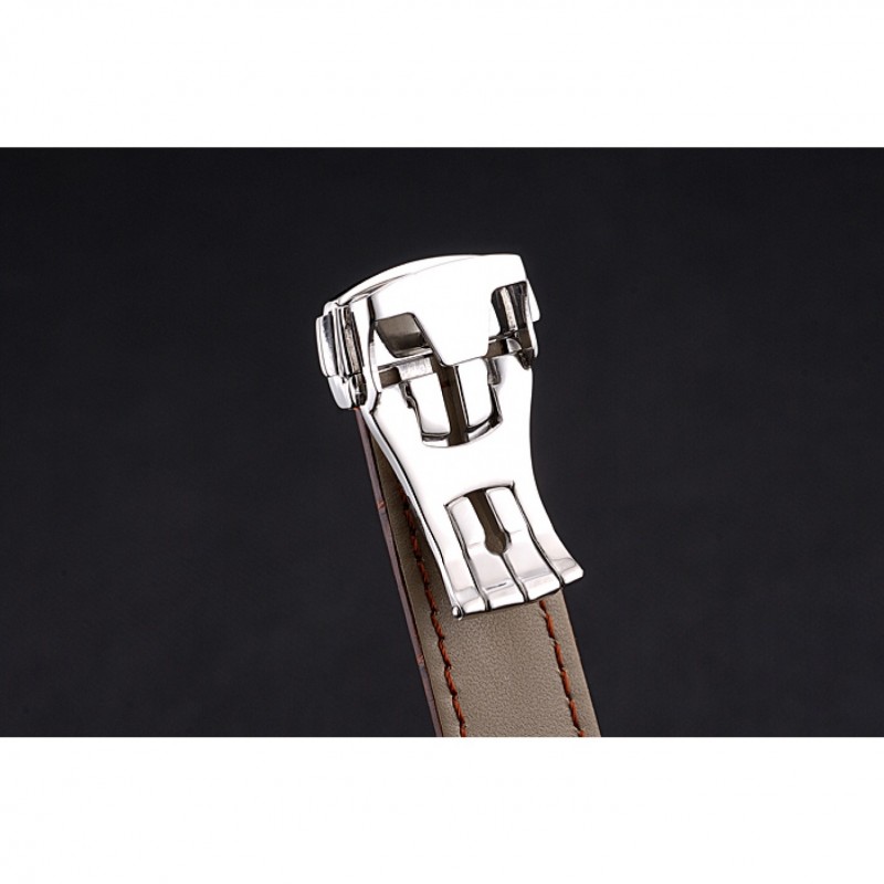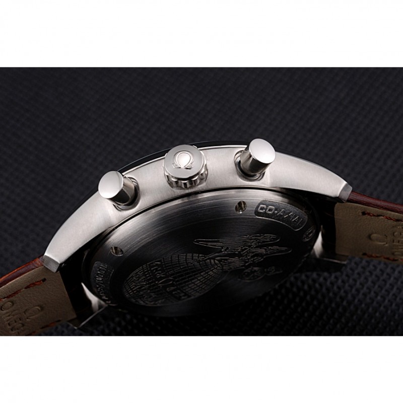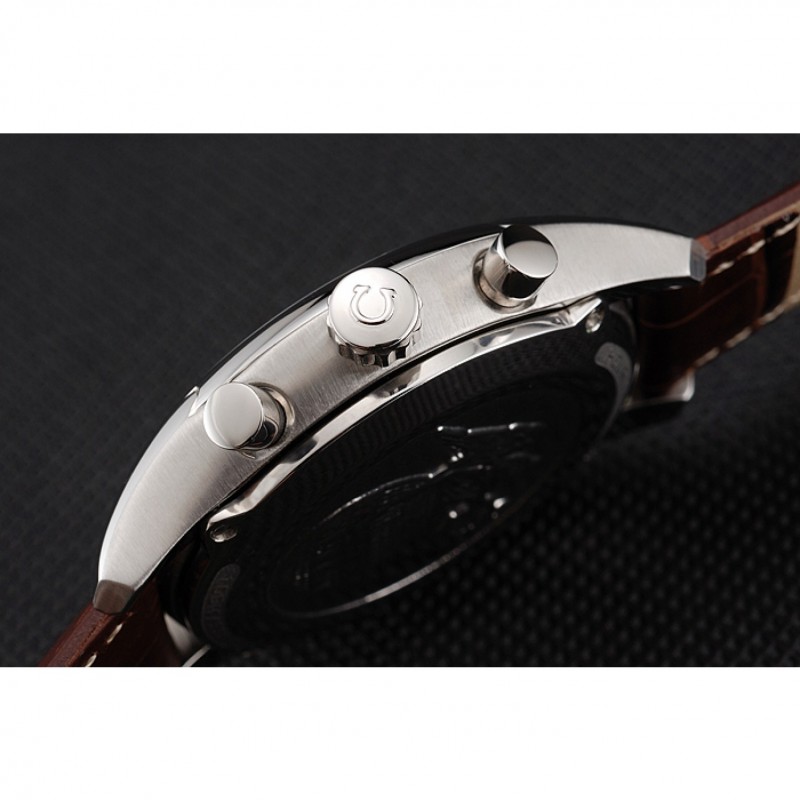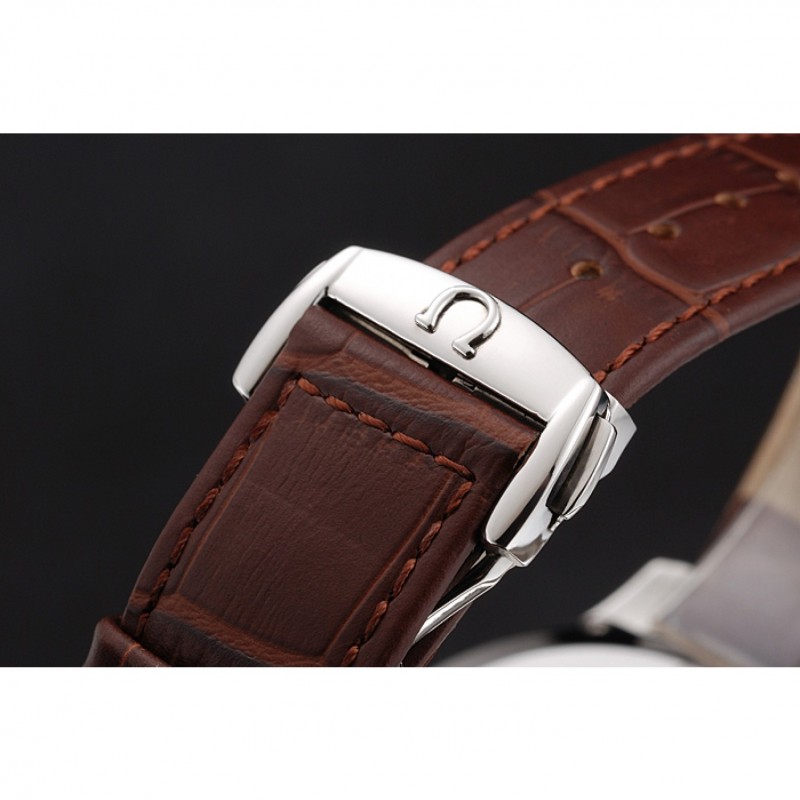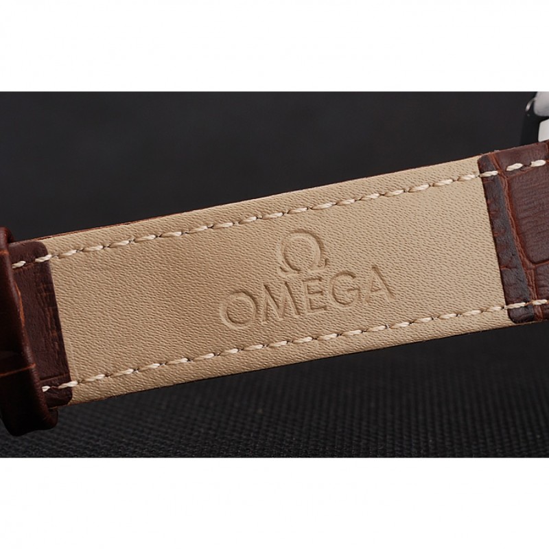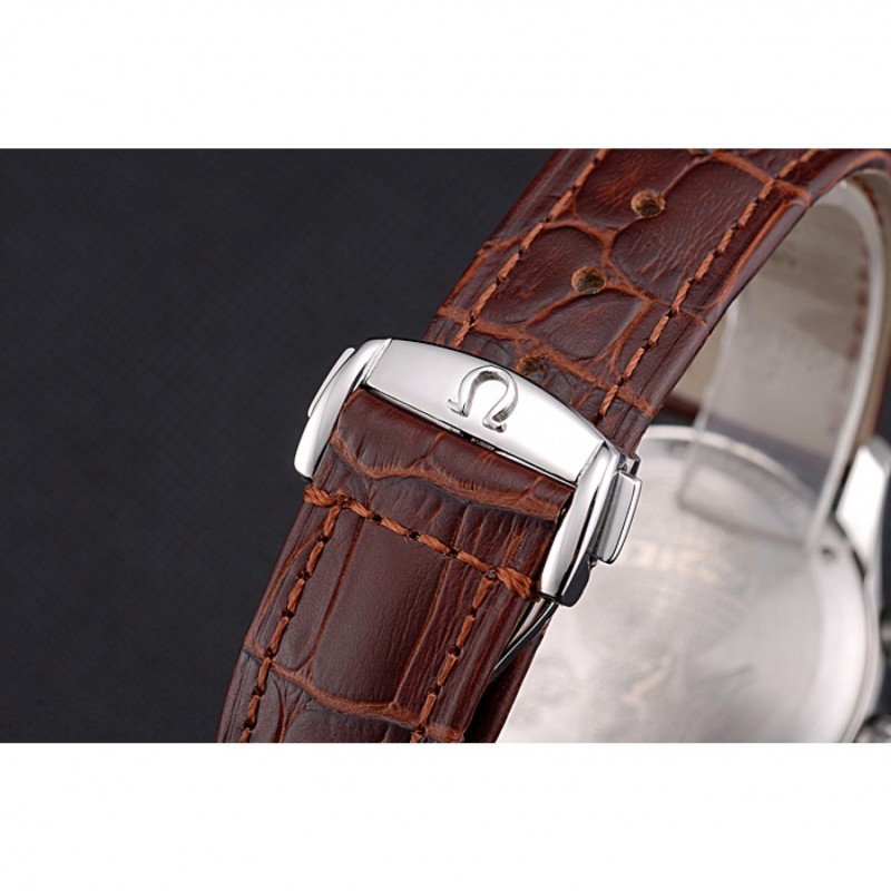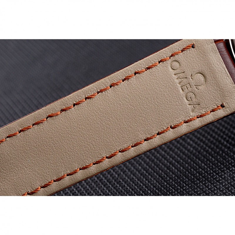 pulsera: Omega, logotipo y código de producto de calor en relieve correa de piel de cocodrilo marrón con el logo grabado de acero inoxidable pulido de liberación empuje el gancho del corchete