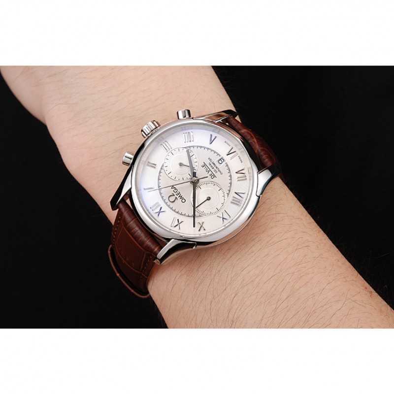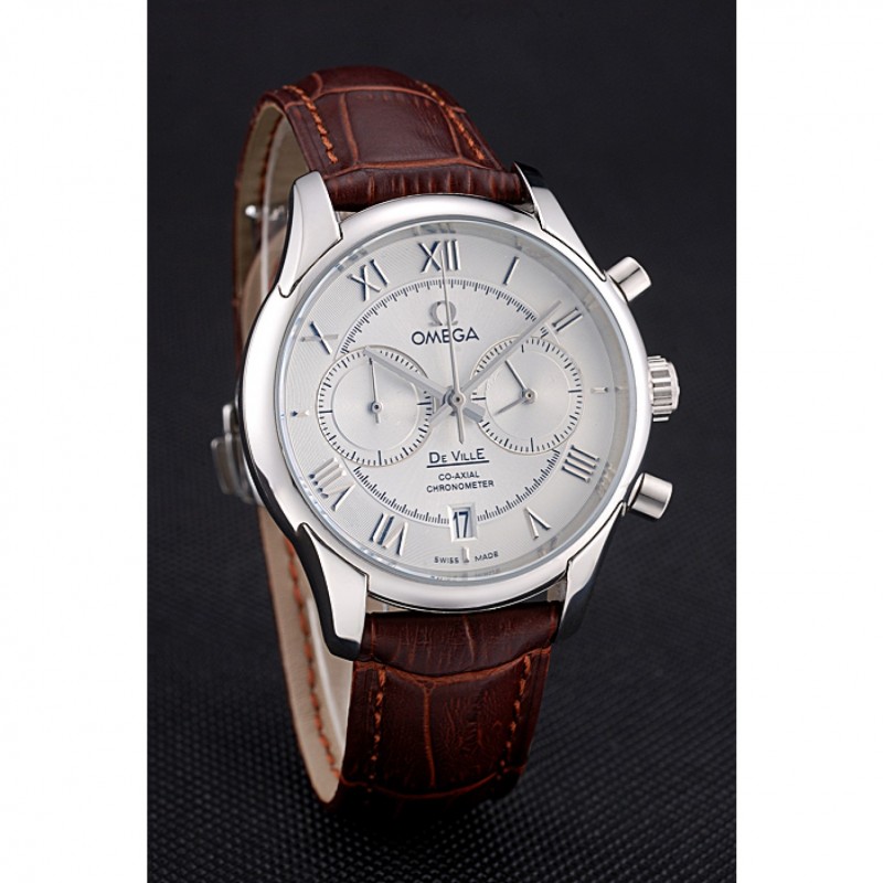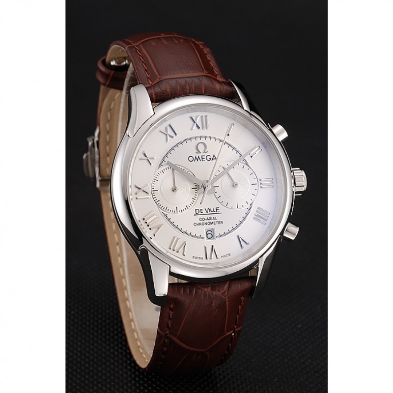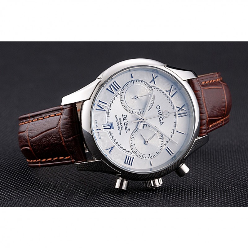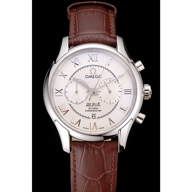 Omega DeVille bisel plateado con esfera blanca y correa de cuero marrón 621566