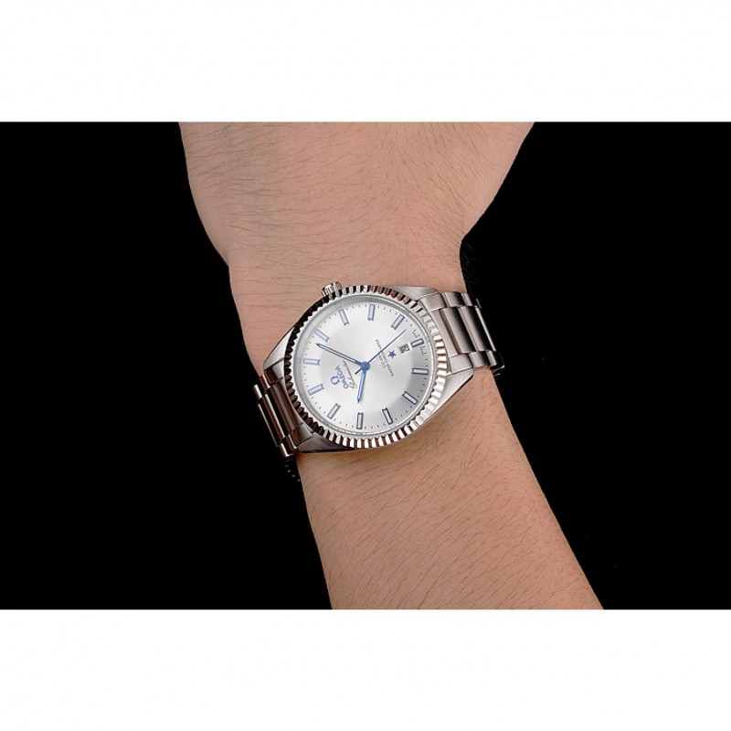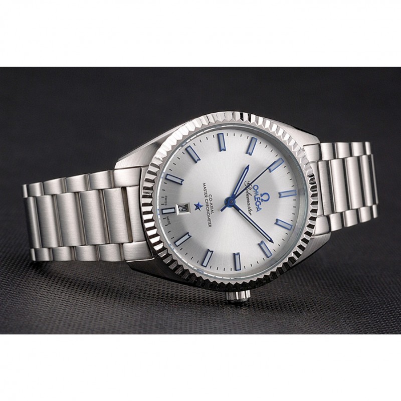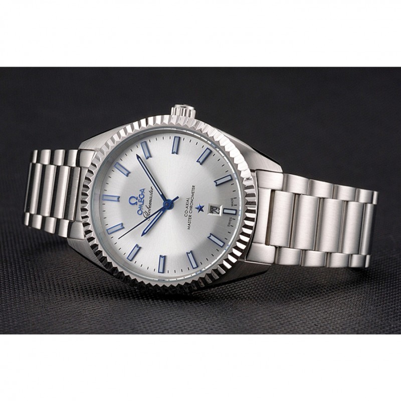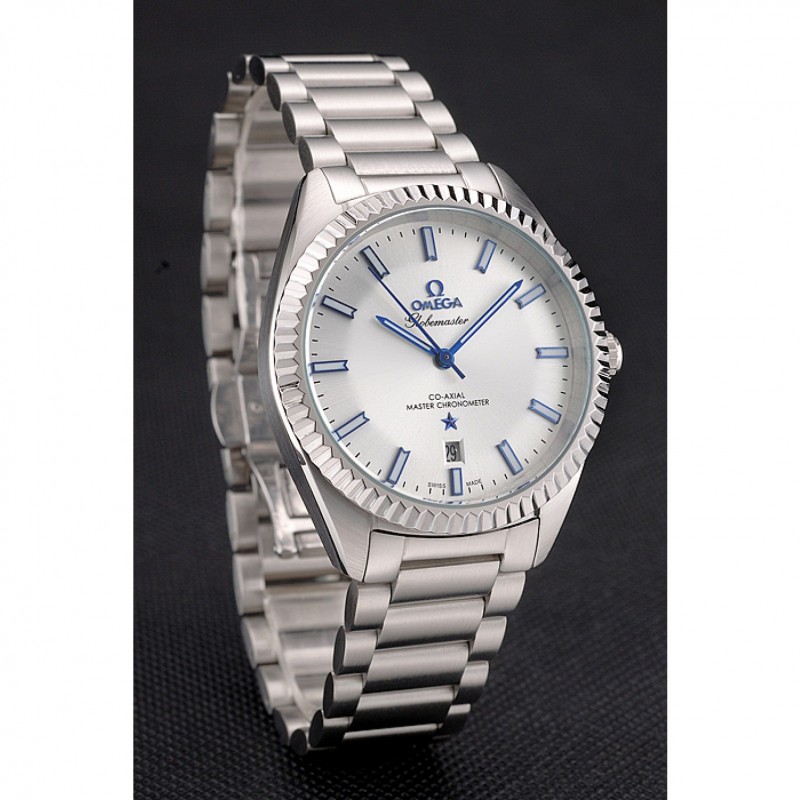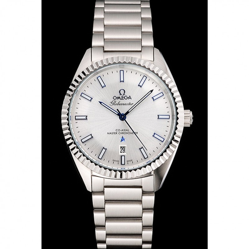 Omega Globemaster de plata esfera azul Manos caja de acero inoxidable y pulsera