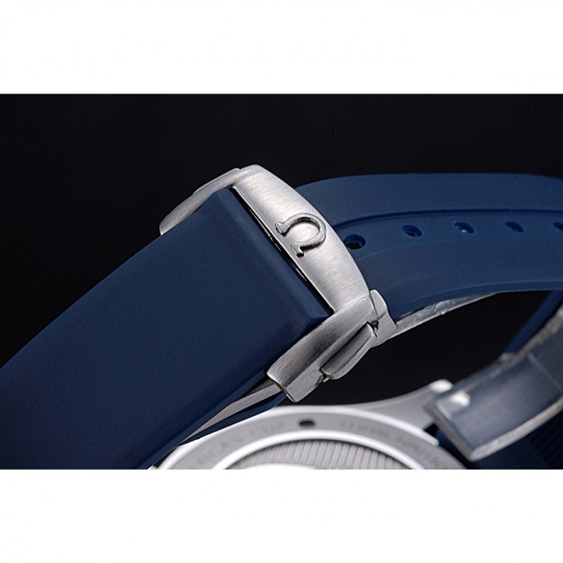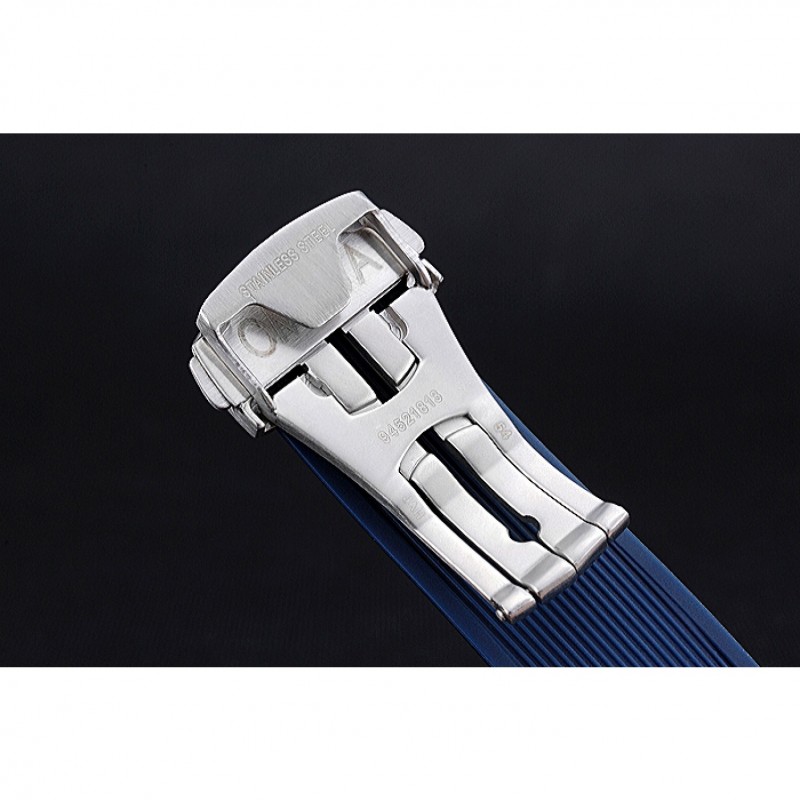 pulsera: correa de caucho azul calor Omega en relieve con logo Omega grabado plegable en acero inoxidable cepillado gancho de liberación empuje corchete