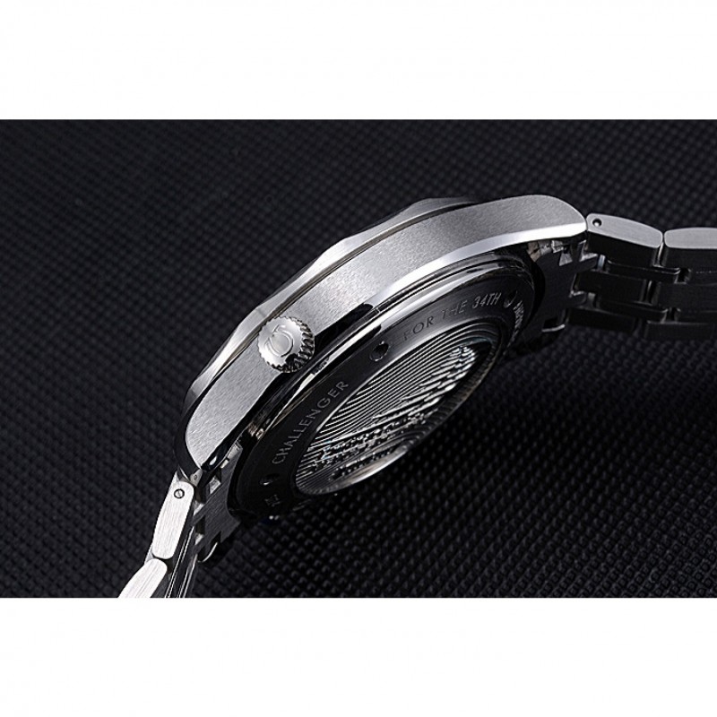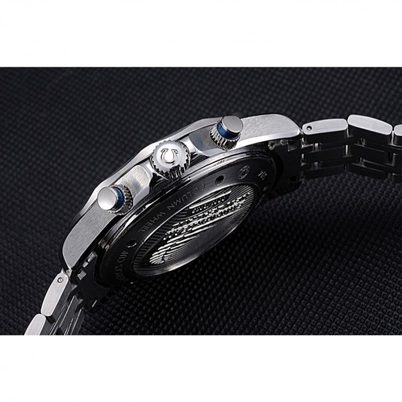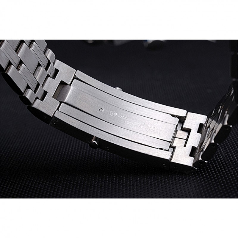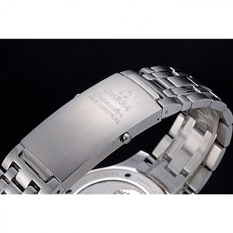 Crown : logo Omega grabado pulido corona cutwork de acero inoxidable con la tira de esmalte negro pulsador ronda corona en cada lado de ella, más un logo grabado pulido corona cutwork de acero inoxidable en la esquina superior opuesta