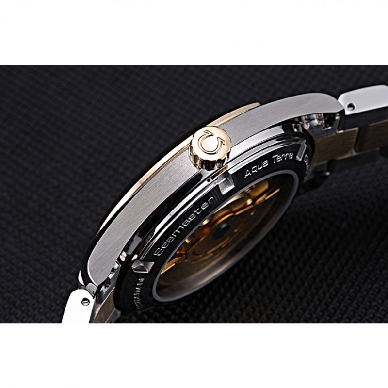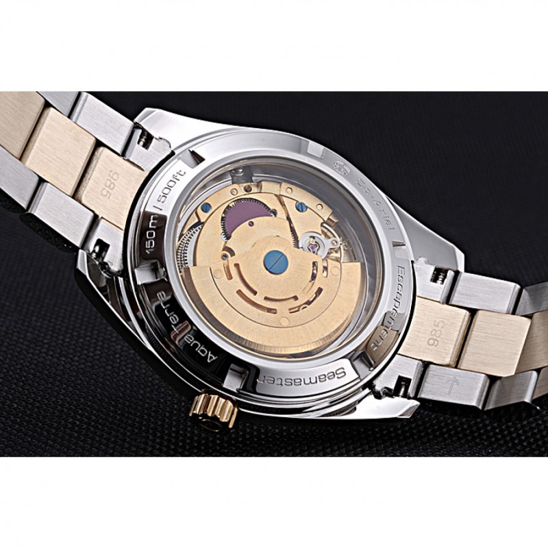 Volver: de acero inoxidable pulido snap-in de vuelta con la mecánica transparentes revelando centro y Omega Seamaster grabado