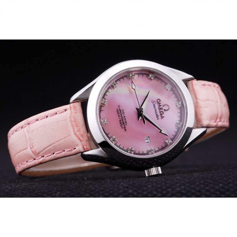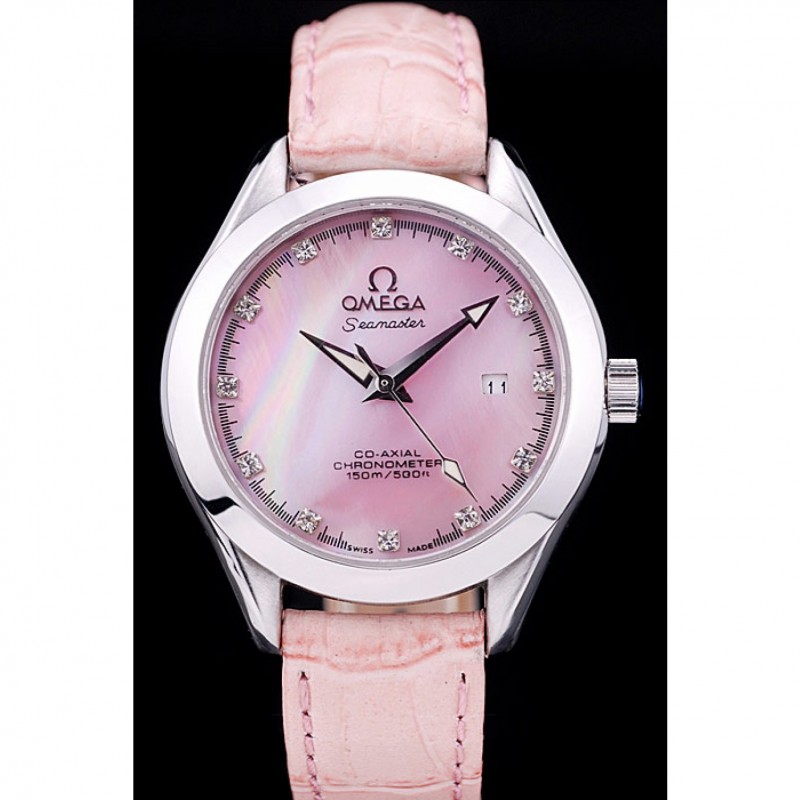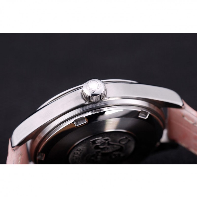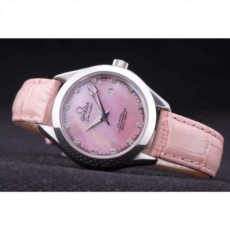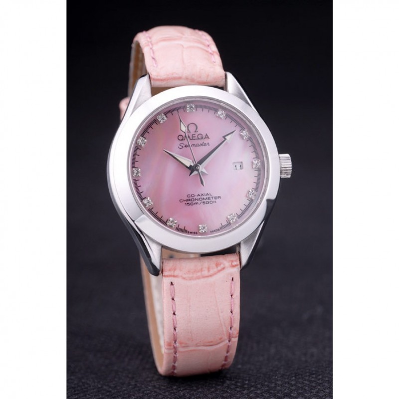 pulsera: correa de piel de cocodrilo de color rosa de calor Omega en relieve con Omega inscrito en acero inoxidable pulido gancho hebilla de cierre