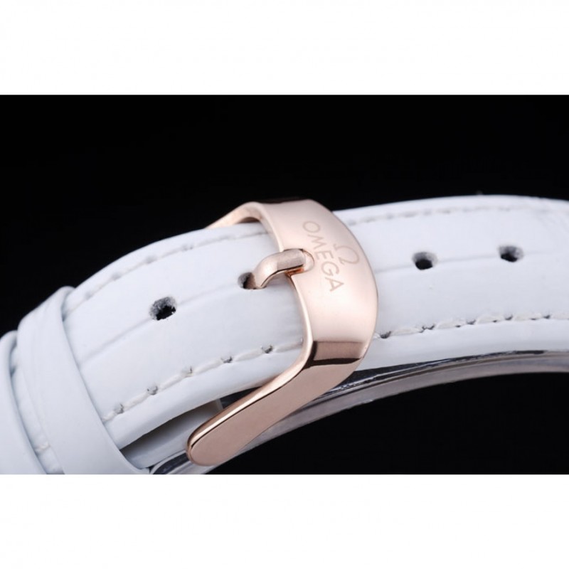 pulsera: correa de piel de cocodrilo de calor Omega en relieve charol blanco con Omega inscrito rosa de 18 quilates chapado en oro gancho hebilla de cierre