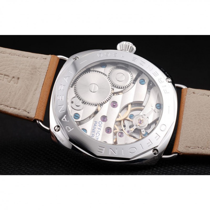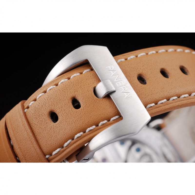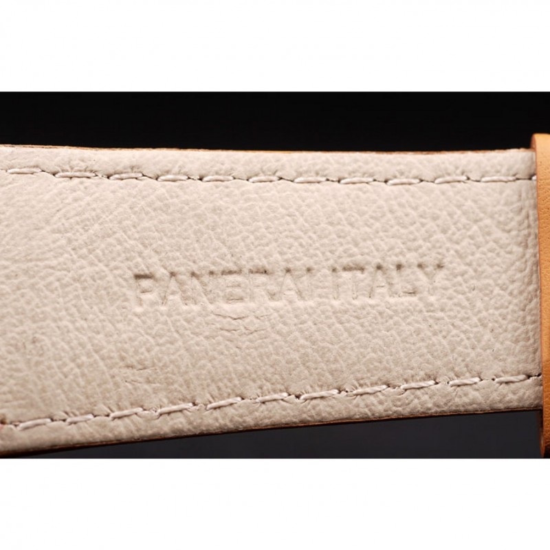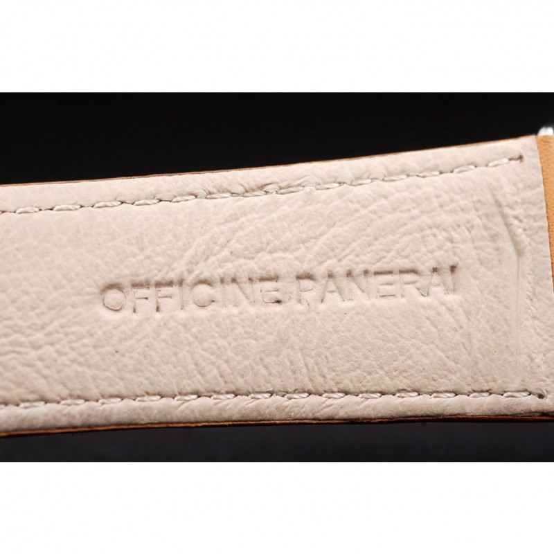 pulsera: correa de cuero marrón claro con costuras de color blanco y el calor en relieve Officine Panerai Italia sello y pulida de acero inoxidable gancho hebilla de cierre con Panerai grabado