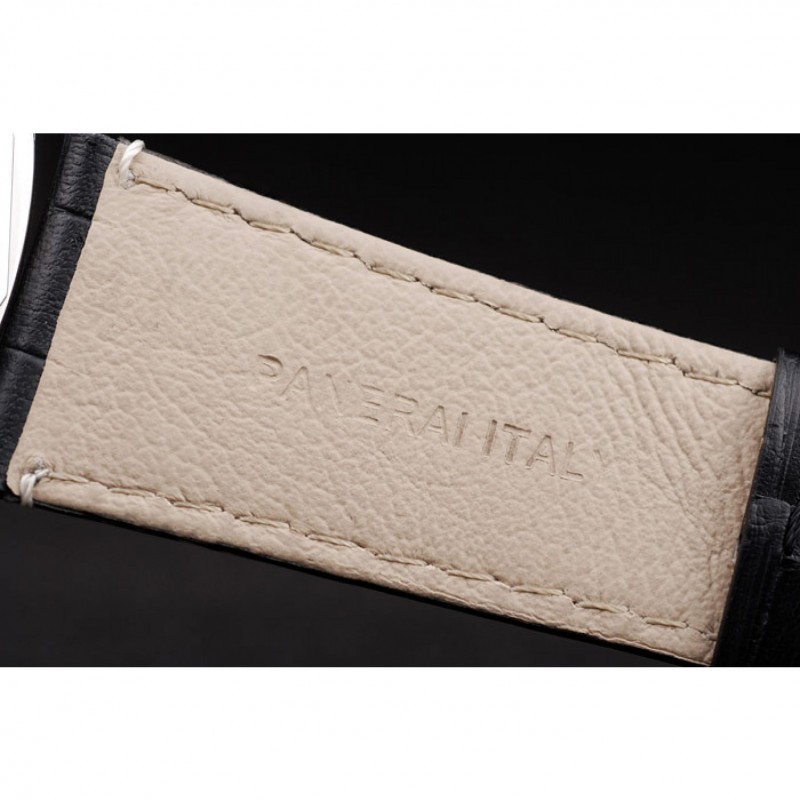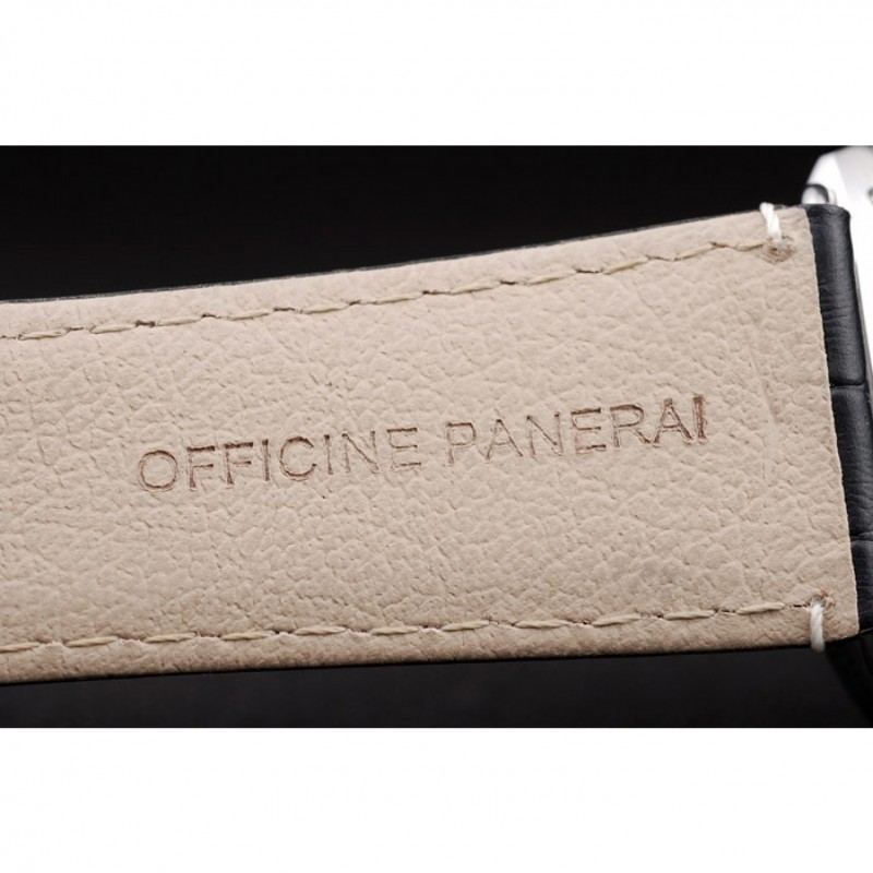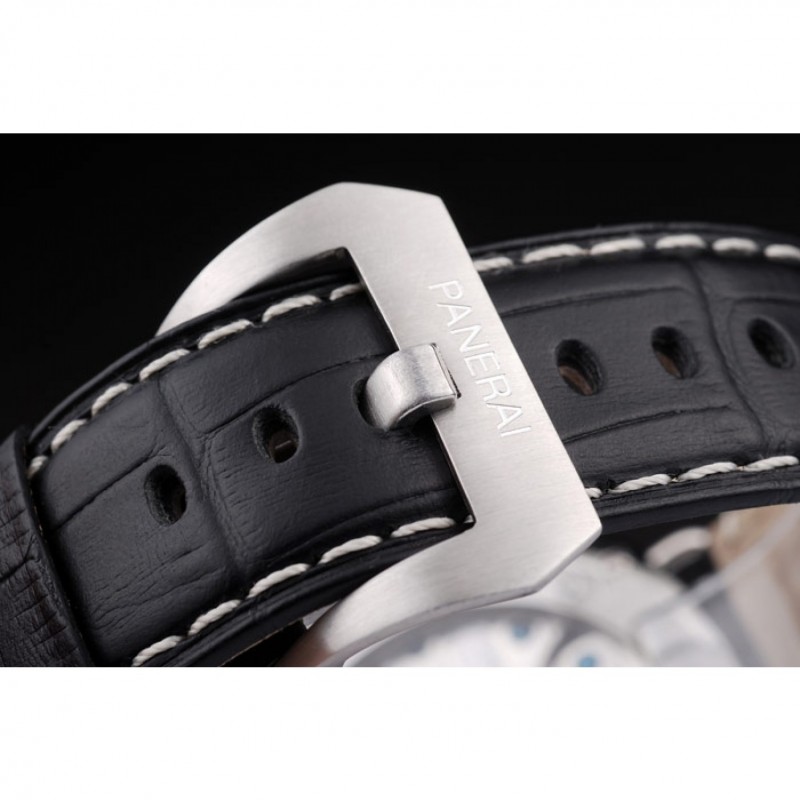 pulsera: correa de piel de cocodrilo negro con costuras en blanco y calor en relieve Officine Panerai Italia sello y acero inoxidable cepillado gancho hebilla de cierre con Panerai grabado