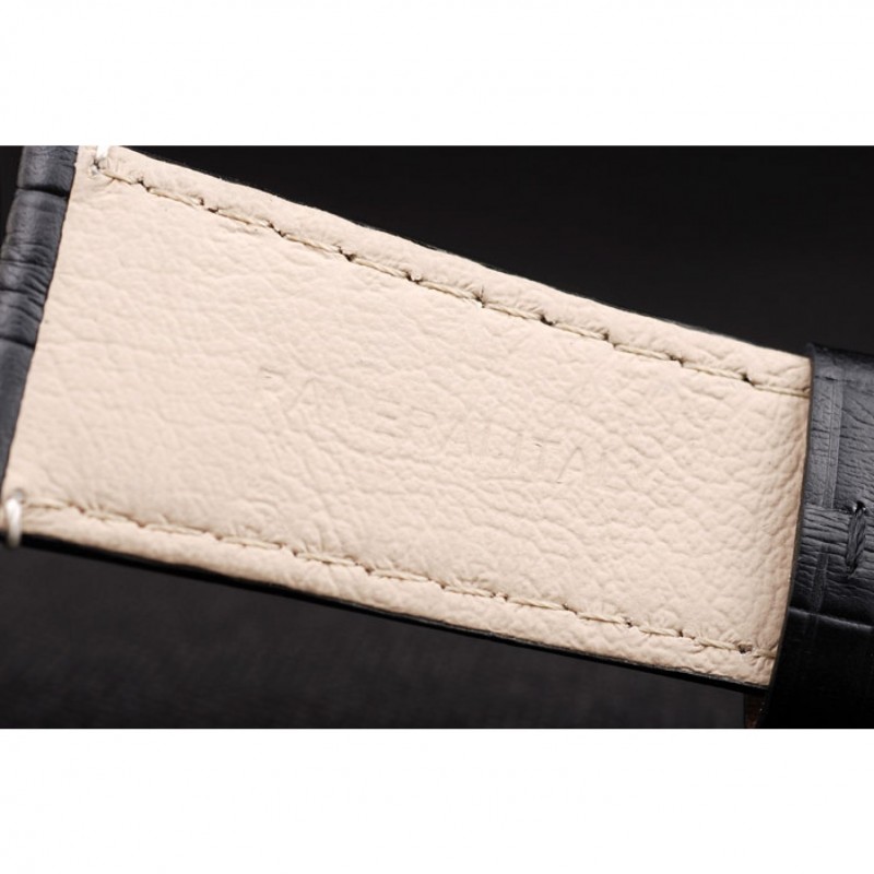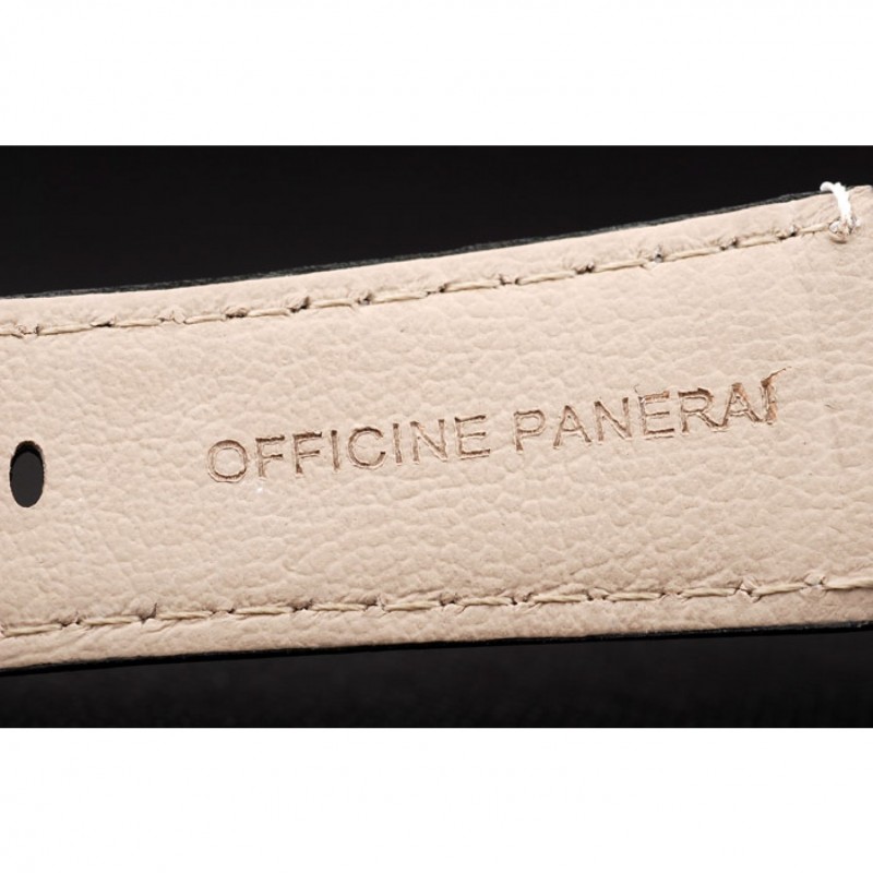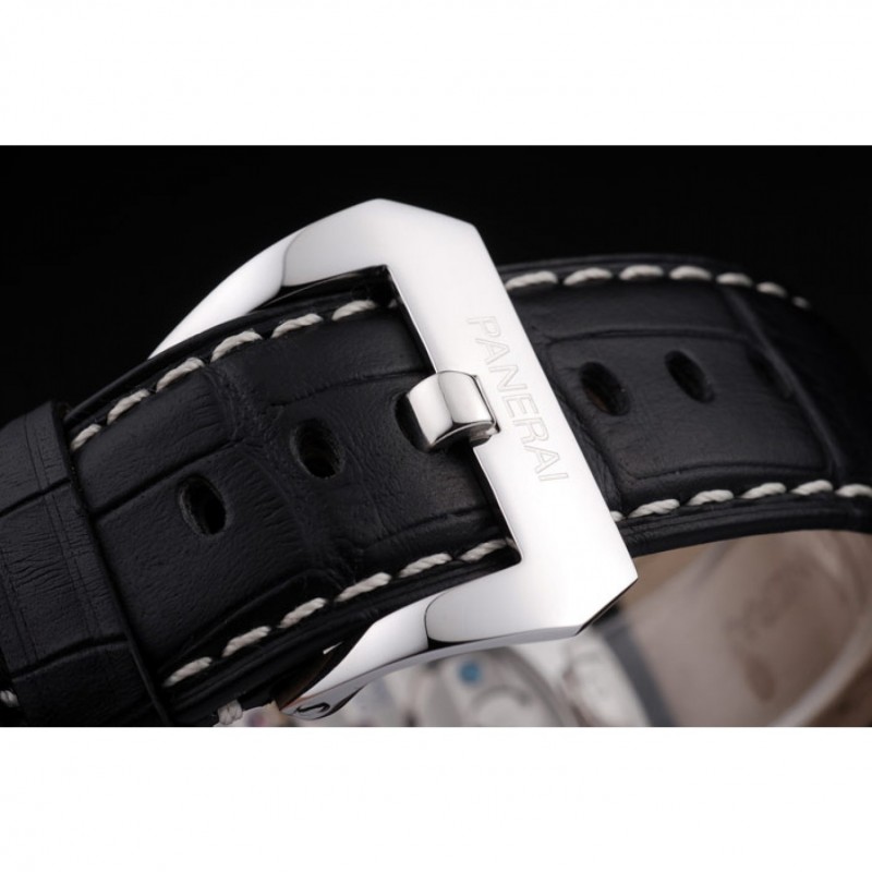 pulsera: correa de piel de cocodrilo negro con costuras en blanco y calor en relieve Officine Panerai Italia sello y pulida de acero inoxidable gancho hebilla de cierre con Panerai grabado