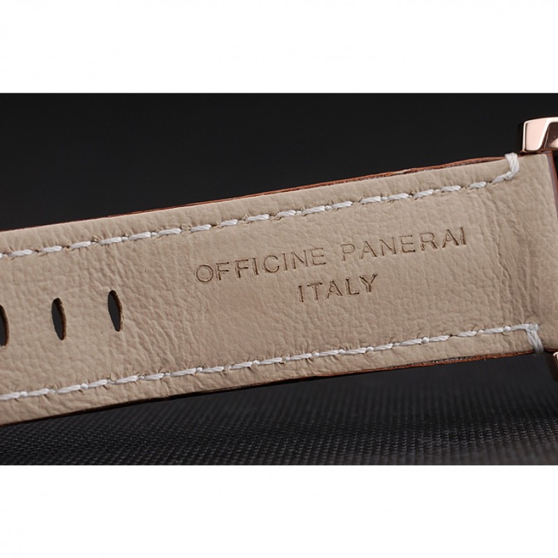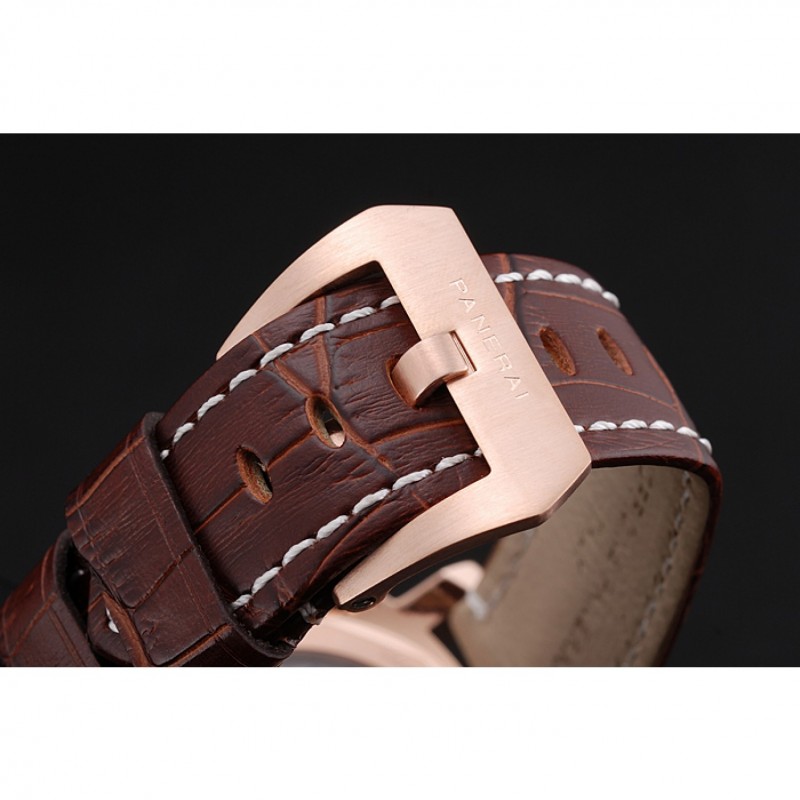 pulsera: correa de piel de cocodrilo marrón Officine Panerai Italia calor en relieve con costuras de hilo blanco y Panerai grabado rosa de 18 quilates chapado en oro gancho hebilla de cierre