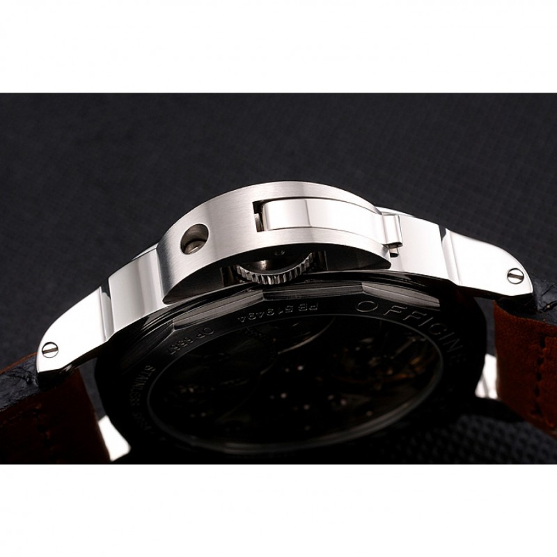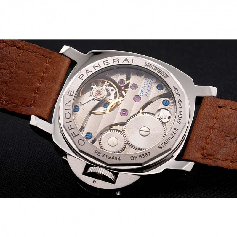 Volver: de acero inoxidable cepillado complemento de nuevo con la mecánica revelando centro y grabados Officine Panerai