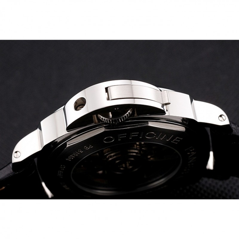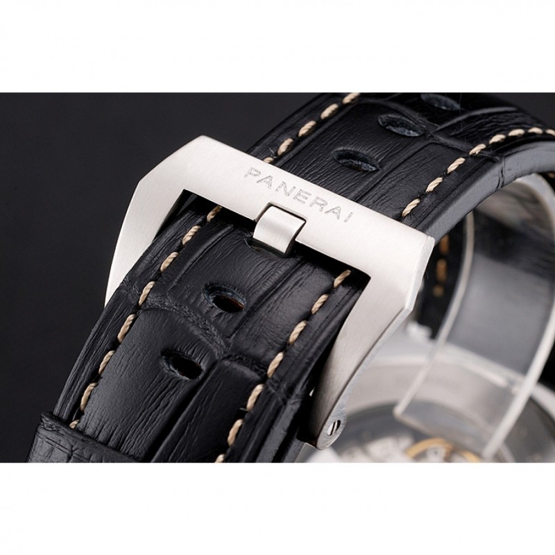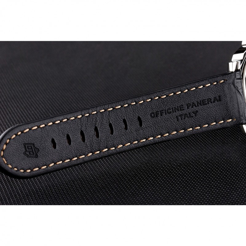 pulsera: relieve Officine Panerai Italia calor correa de cuero negro con costuras de hilo blanco y Panerai grabado de acero inoxidable cepillado gancho hebilla de cierre