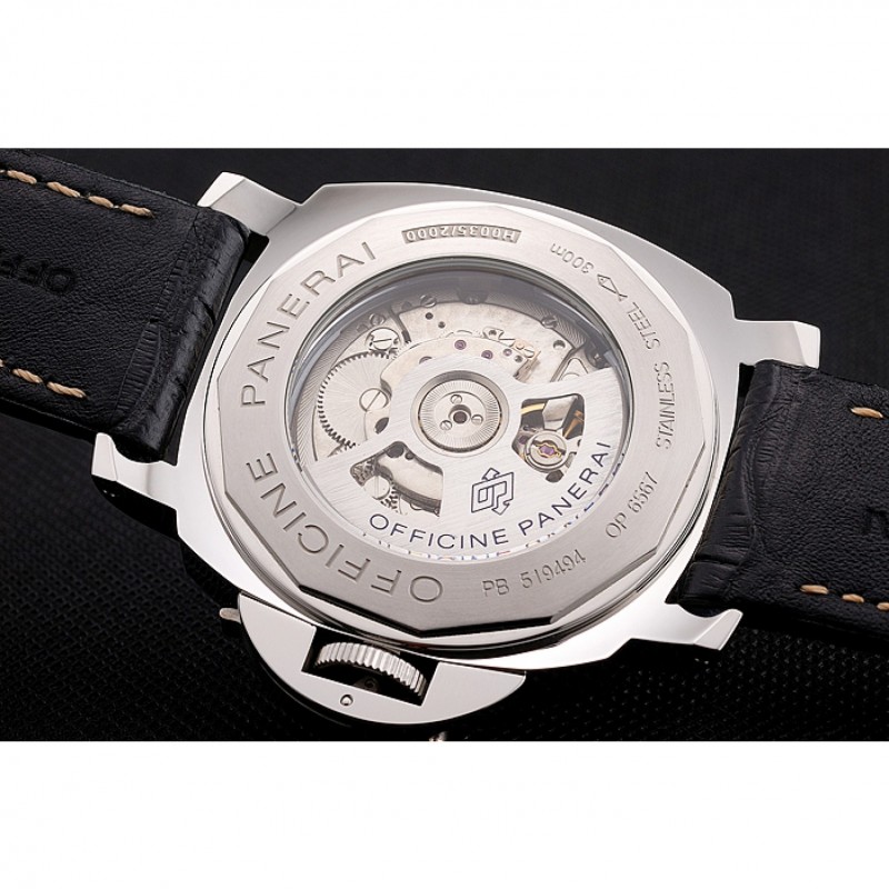 Volver: de acero inoxidable cepillado complemento de nuevo con la mecánica revelando centro y grabados Officine Panerai