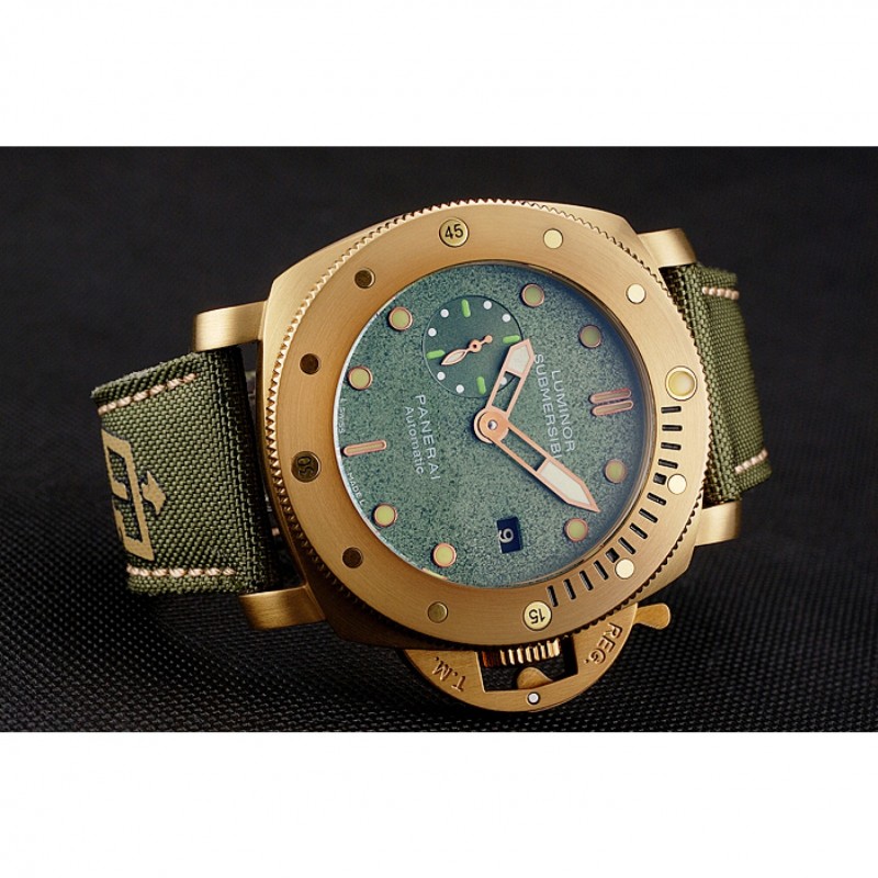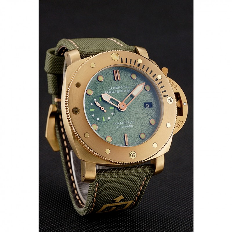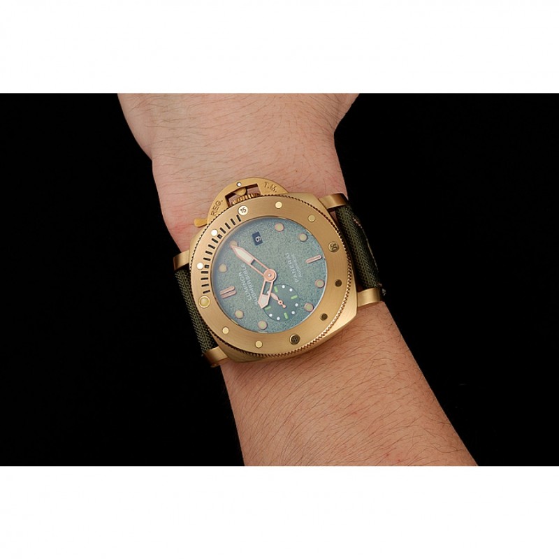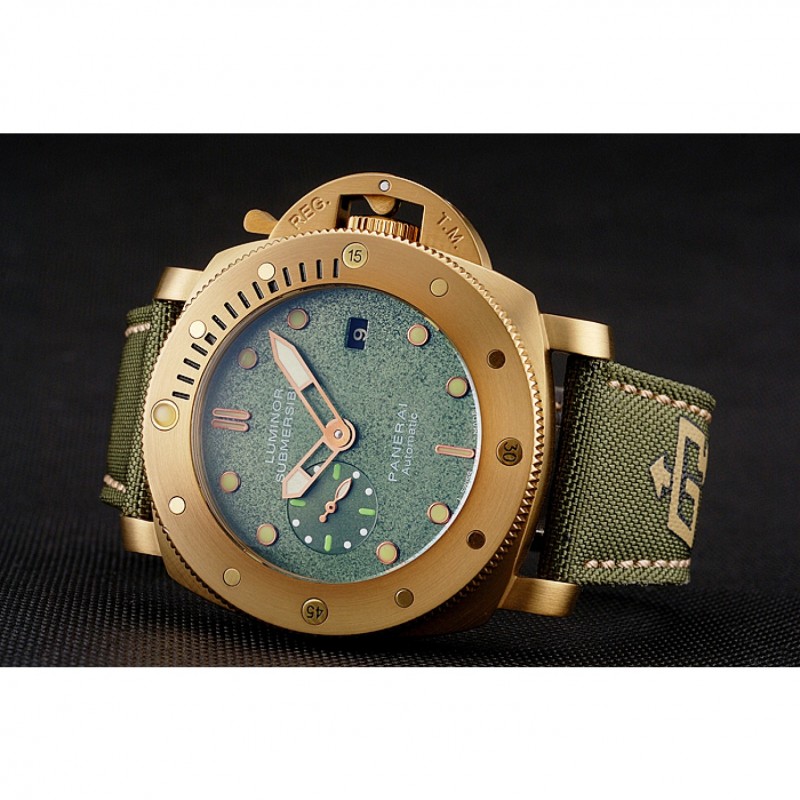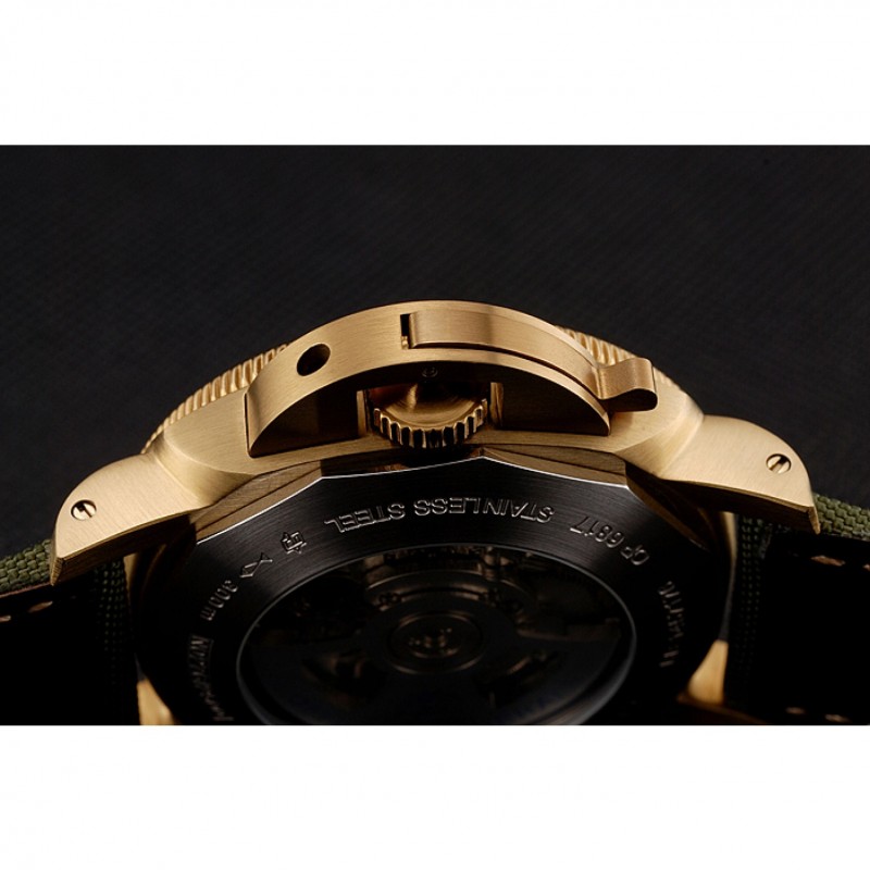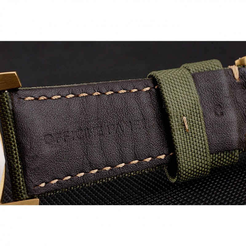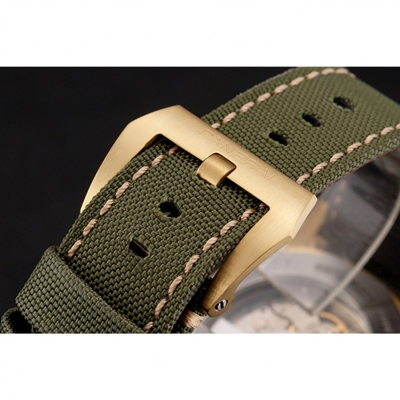 pulsera: relieve calor Officine Panerai correa de tela verde con costuras de hilo beige y Panerai grabado 18k oro amarillo plateado gancho hebilla de cierre