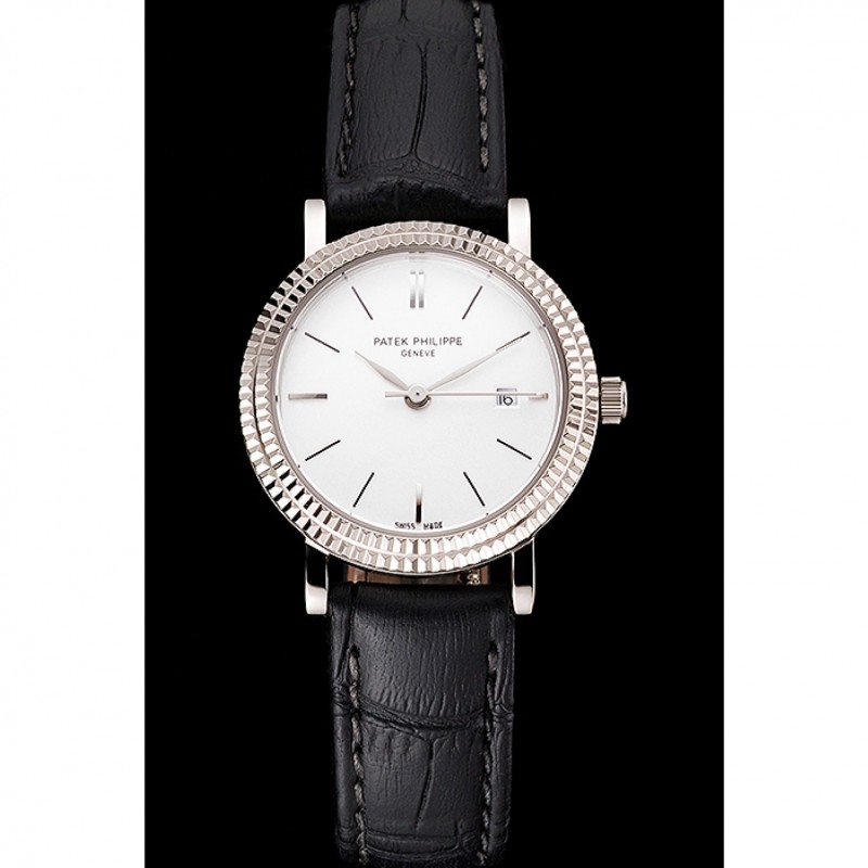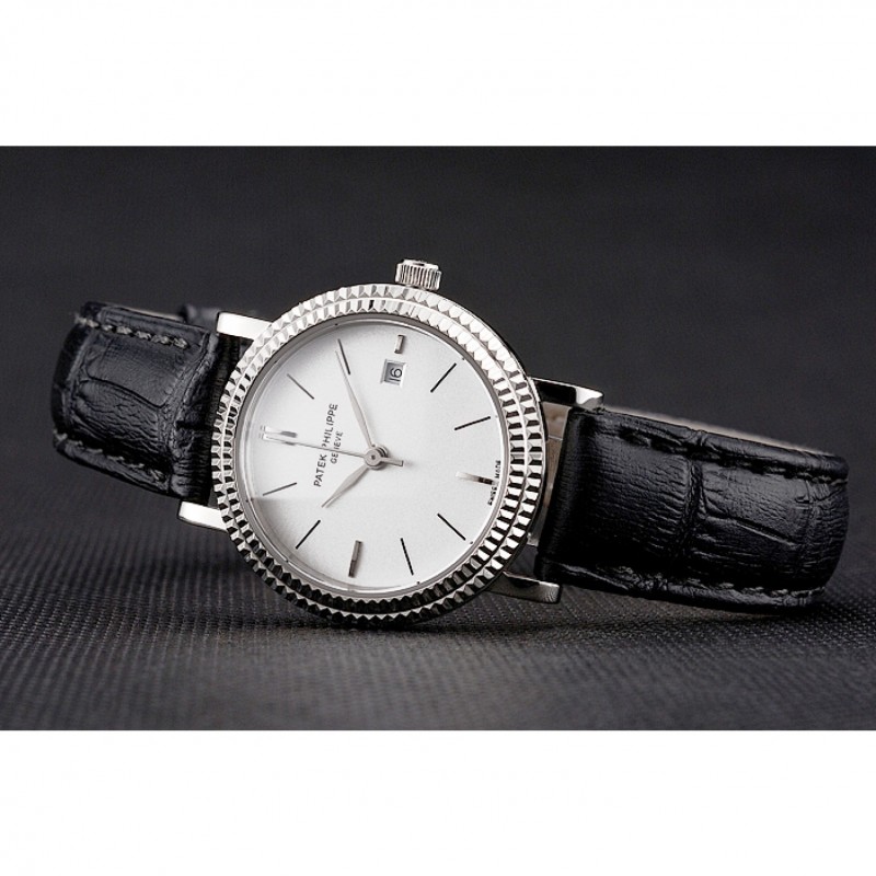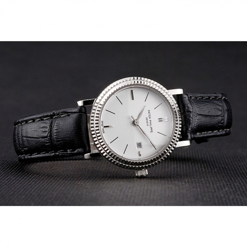 Patek Philippe Blanco Dial correa de cuero de doble bisel acanalado caja de acero inoxidable Negro