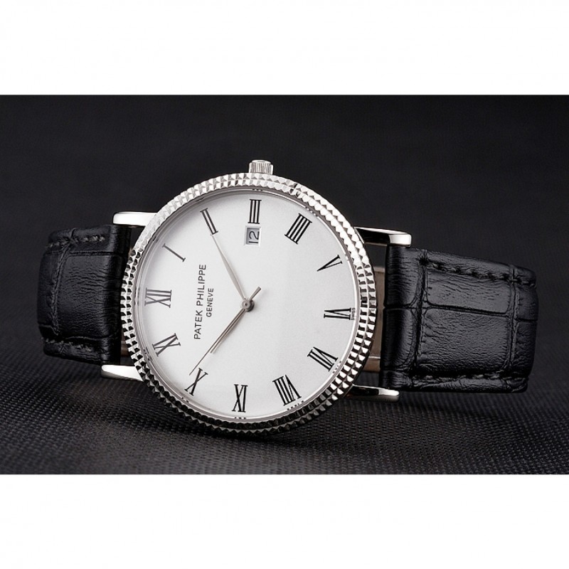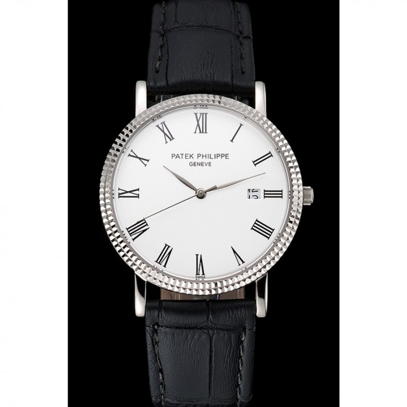 Patek Philippe Blanco Dial correa de cuero de los números romanos Bisel acanalado caja de acero inoxidable Negro