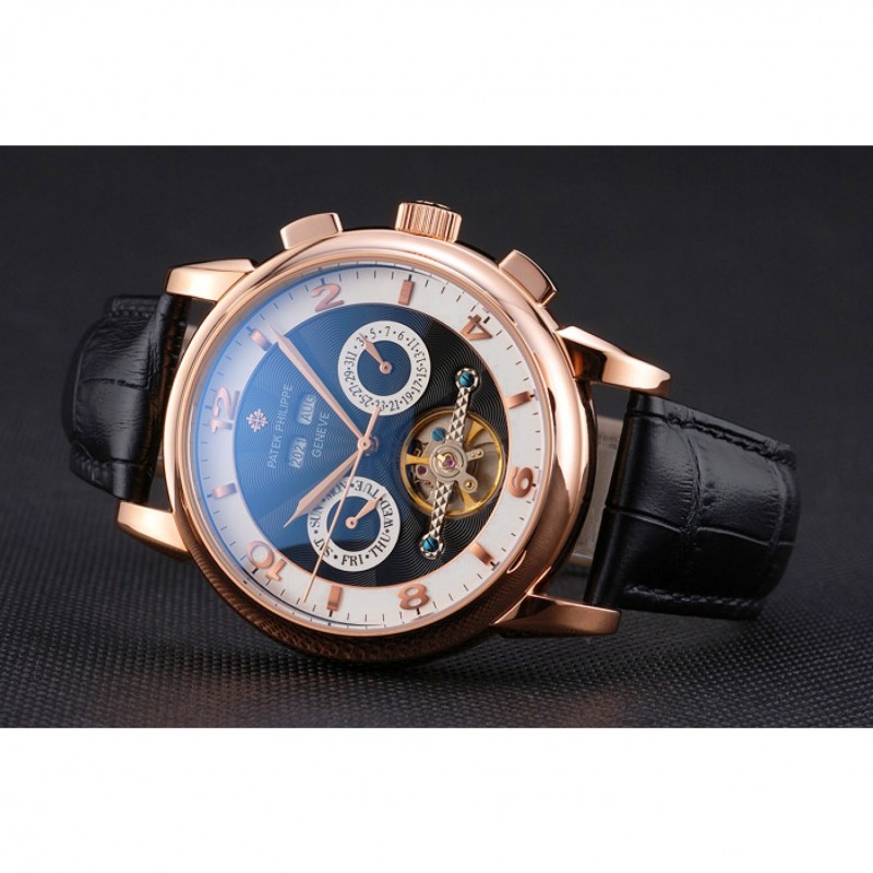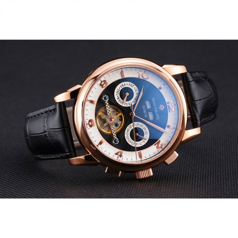 Patek Philippe Calendario Perpetuo Tourbillon Blanco Y Negro Dial correa de cuero de la caja de oro rosa Negro