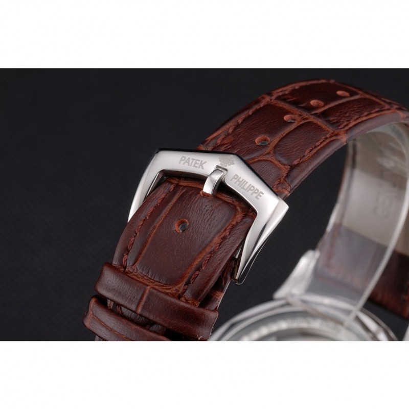 pulsera: correa de piel de cocodrilo marrón de calor Patek Philippe Geneve en relieve con el logotipo y Patek Philippe inscrito pulida de acero inoxidable gancho hebilla de cierre