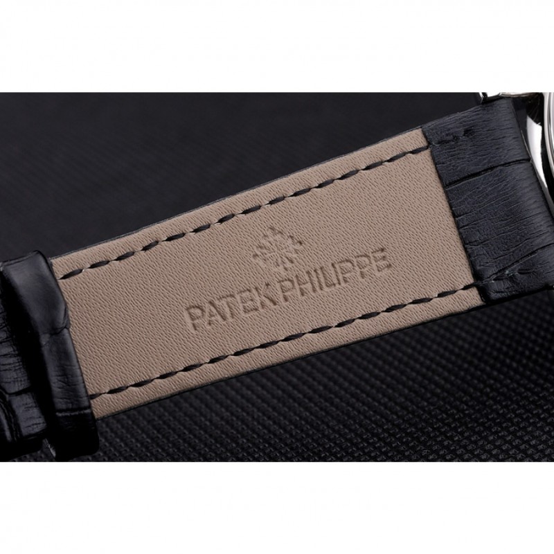 pulsera: correa de piel de cocodrilo negro de calor Patek Philippe Geneve en relieve con el logotipo y Patek Philippe inscrito pulida de acero inoxidable gancho hebilla de cierre