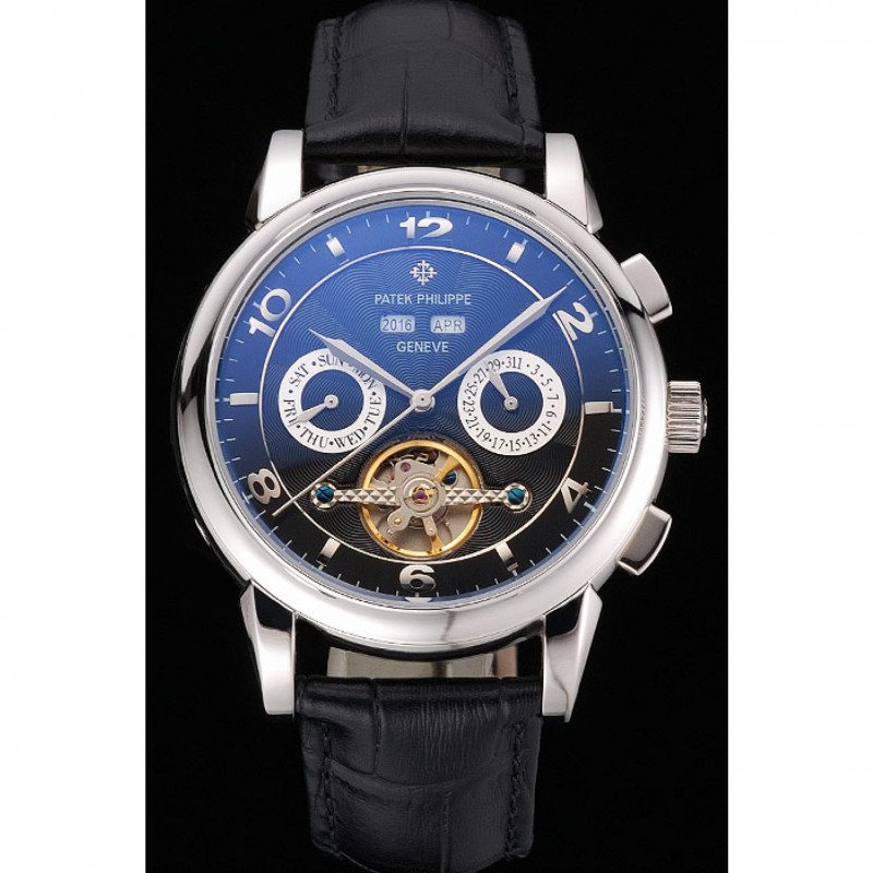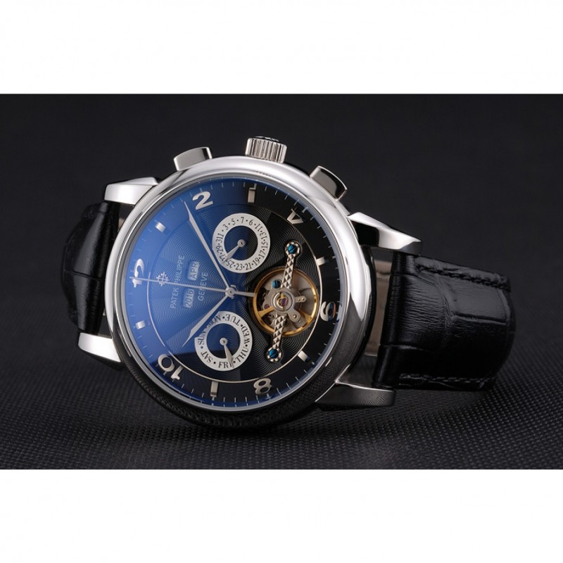 Patek Philippe Calendario Perpetuo Tourbillon Negro Dial correa de cuero caja de acero inoxidable Negro
