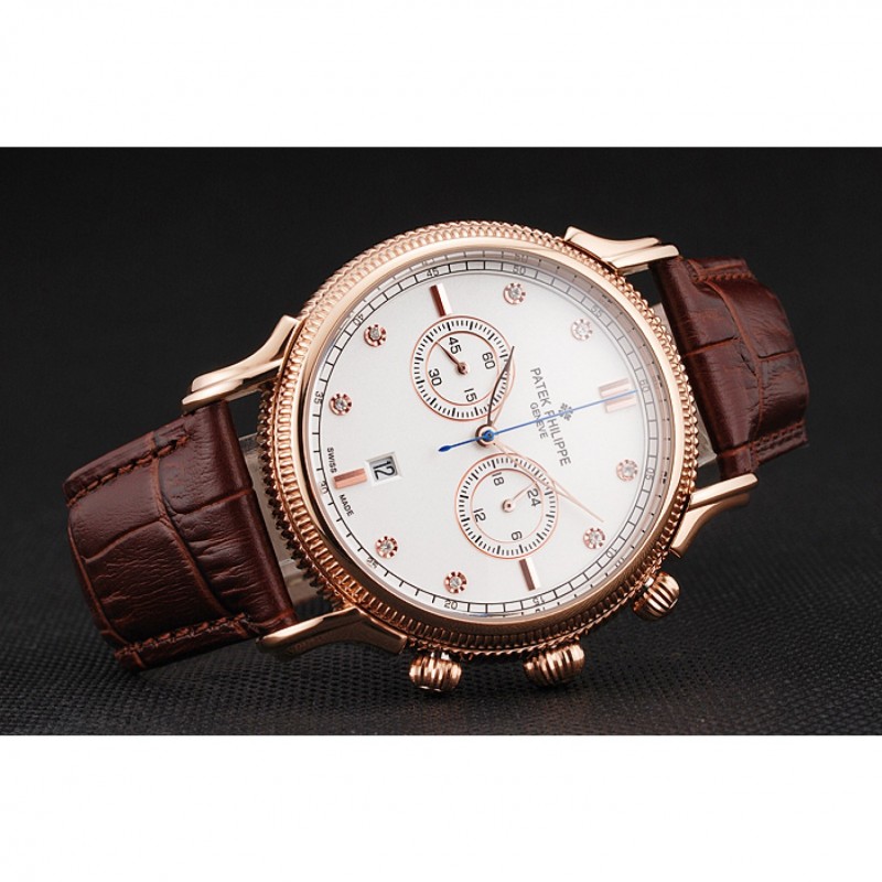Patek Philippe cronógrafo esfera blanca con diamantes correa de cuero de la caja de oro rosa Brown