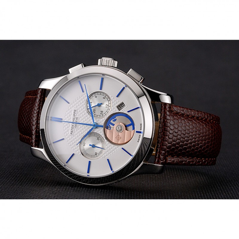 Patek Philippe cronógrafo Esfera Blanca, Correa de cuero azul Manos caja de acero inoxidable de Brown