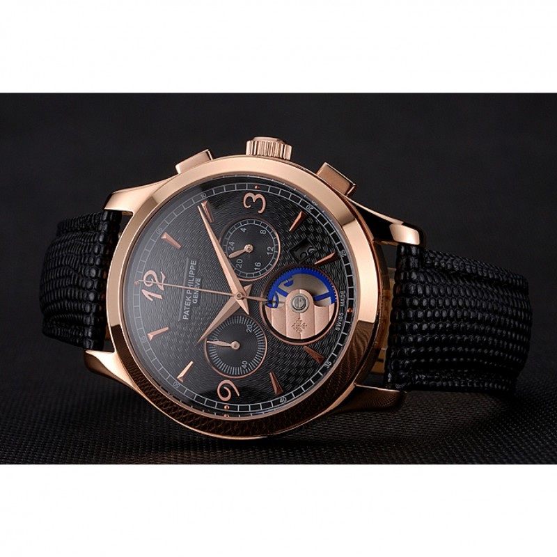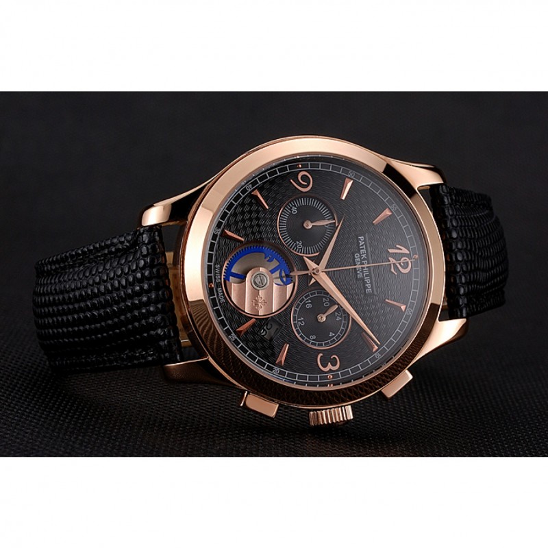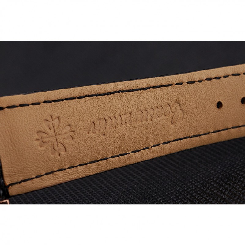 Patek Philippe cronógrafo Guilloche Negro Dial correa de cuero de la caja de oro rosa Negro