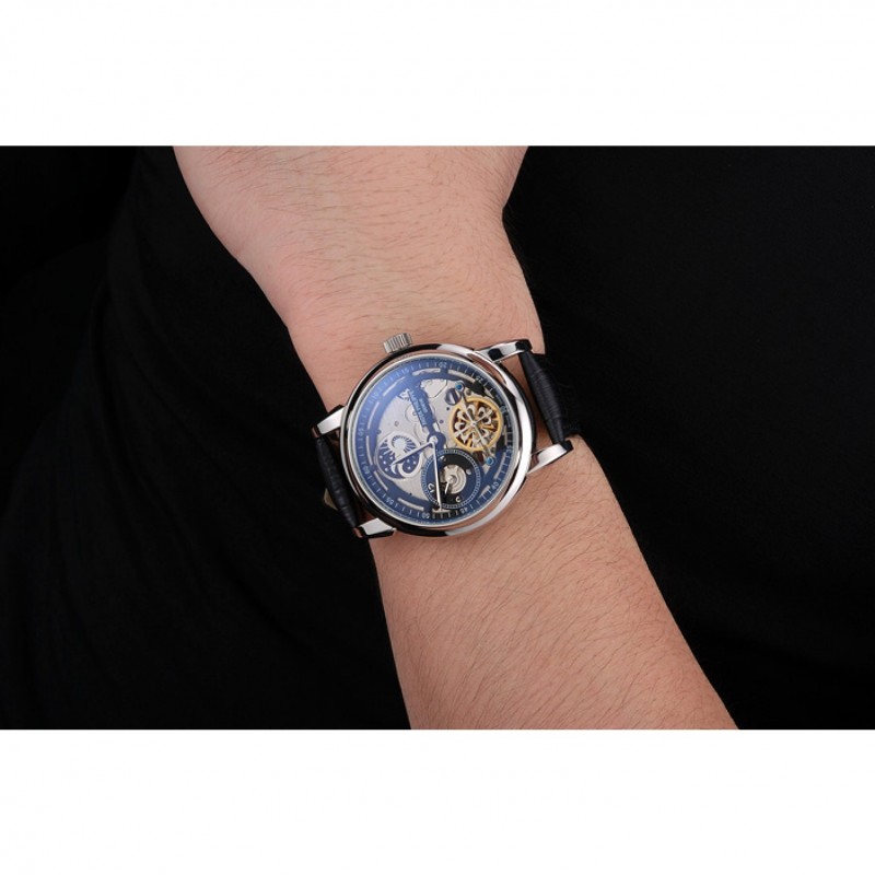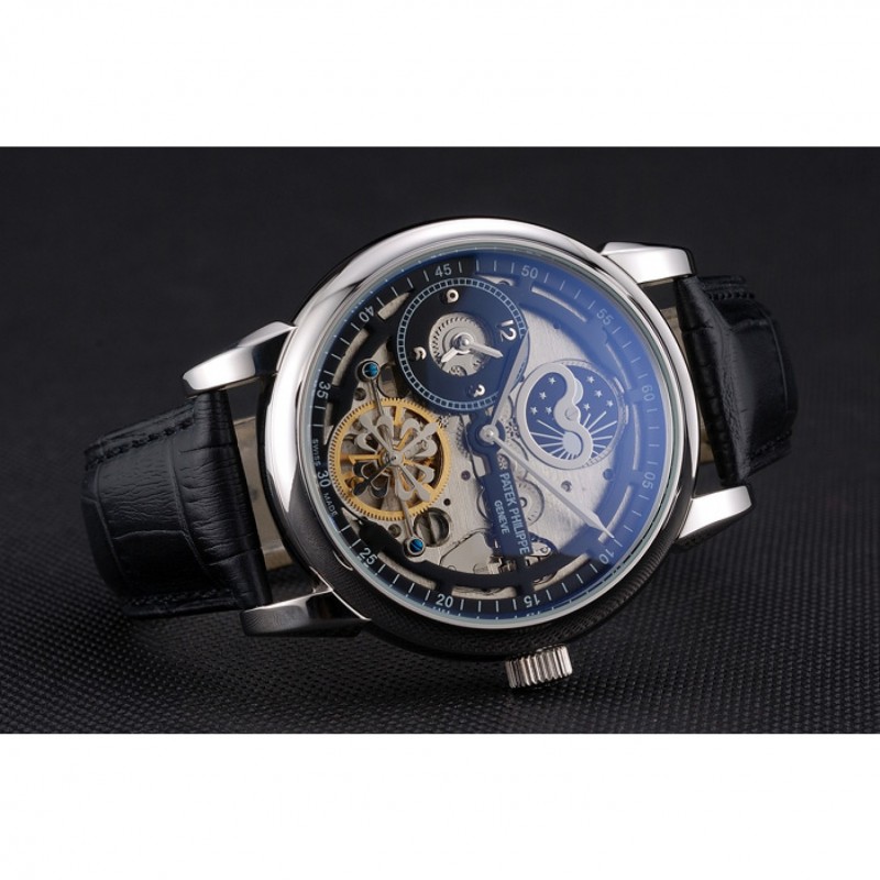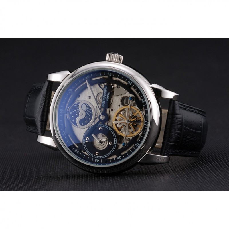 Patek Philippe de hora dual Fase Lunar Tourbillon Negro skeletonised Dial correa de cuero caja de acero inoxidable Negro