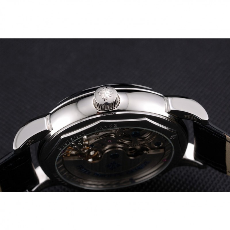 Volver: de acero inoxidable pulido a presión con montura -en la espalda con la mecánica transparentes revelando centro y grabados Patek Philippe