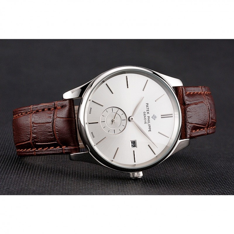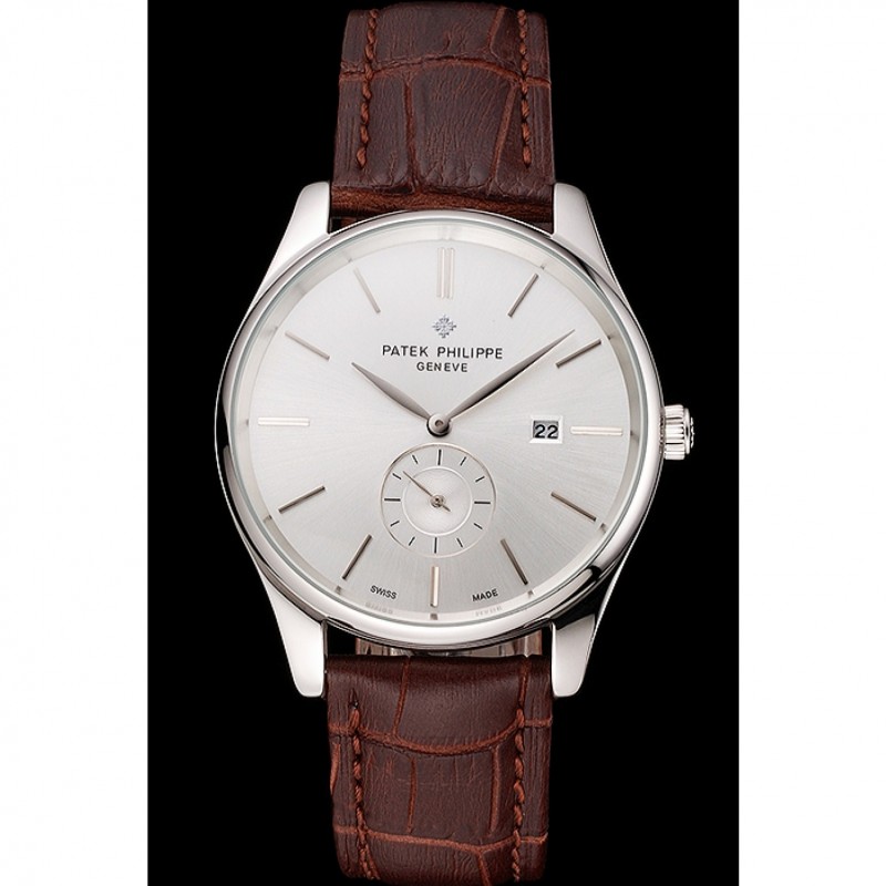 Patek Philippe Fecha de plata Dial correa de cuero caja de acero inoxidable de Brown
