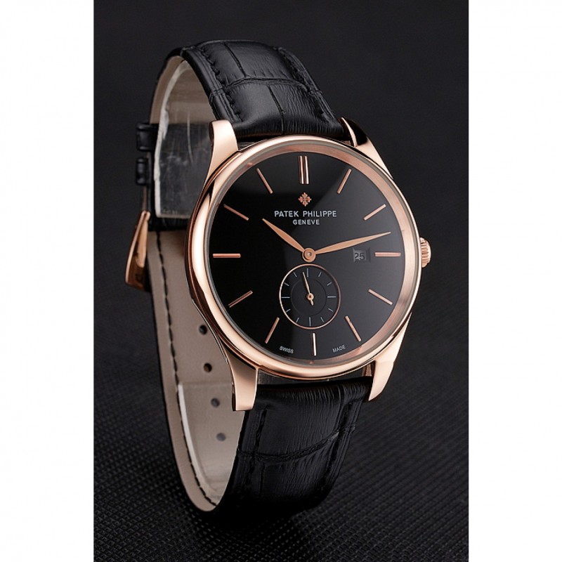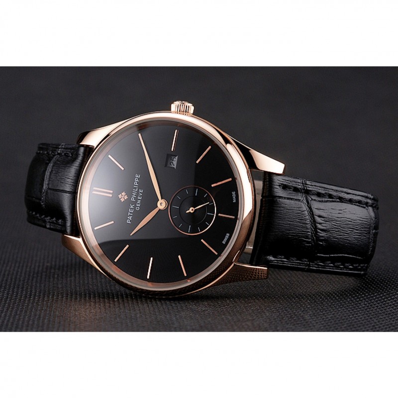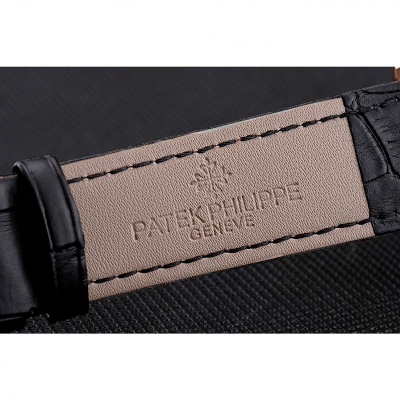 Patek Philippe Fecha Negro Dial correa de cuero de la caja de oro rosa Negro