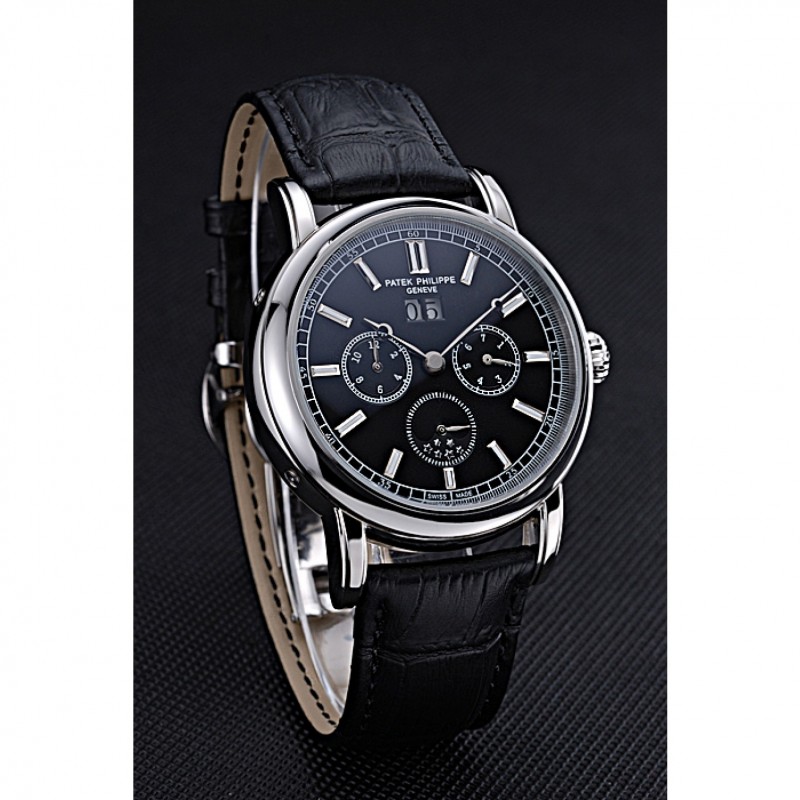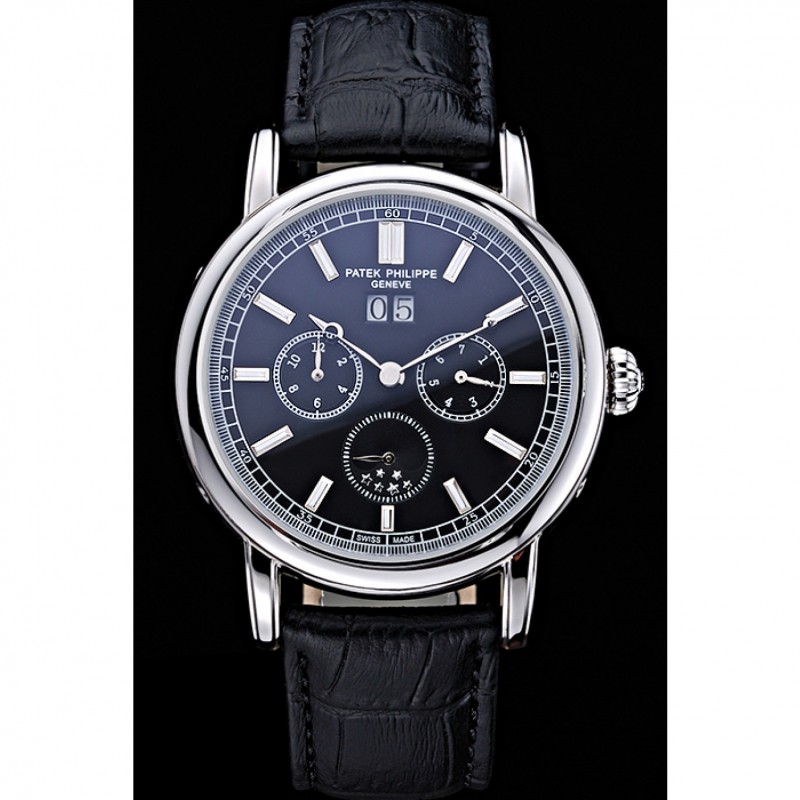 Patek Philippe Geneve Grand complicaciones Negro Dial acero inoxidable Bisel Negro banda de cuero 622153