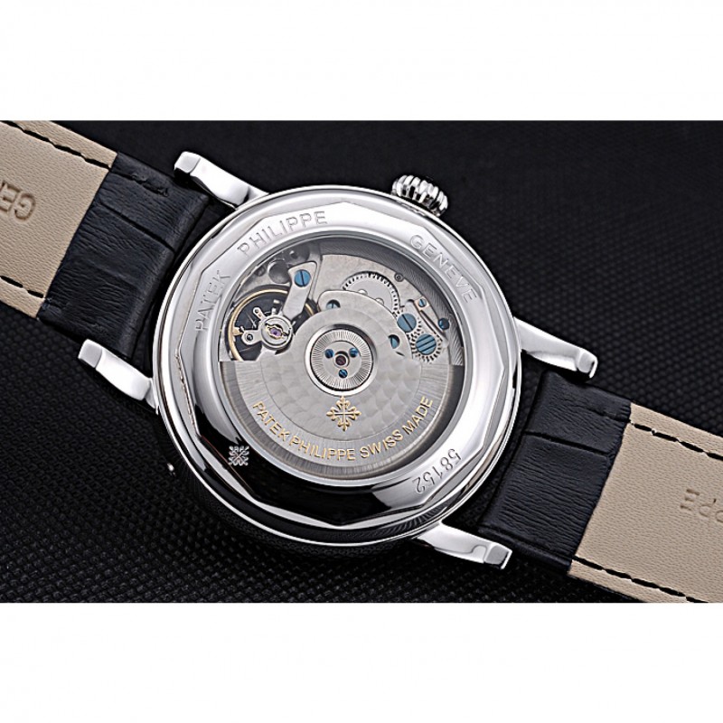 Volver: pulido Snap acero inoxidable en la parte trasera con la mecánica transparentes revelando centro y Patek Philippe Geneve grabado