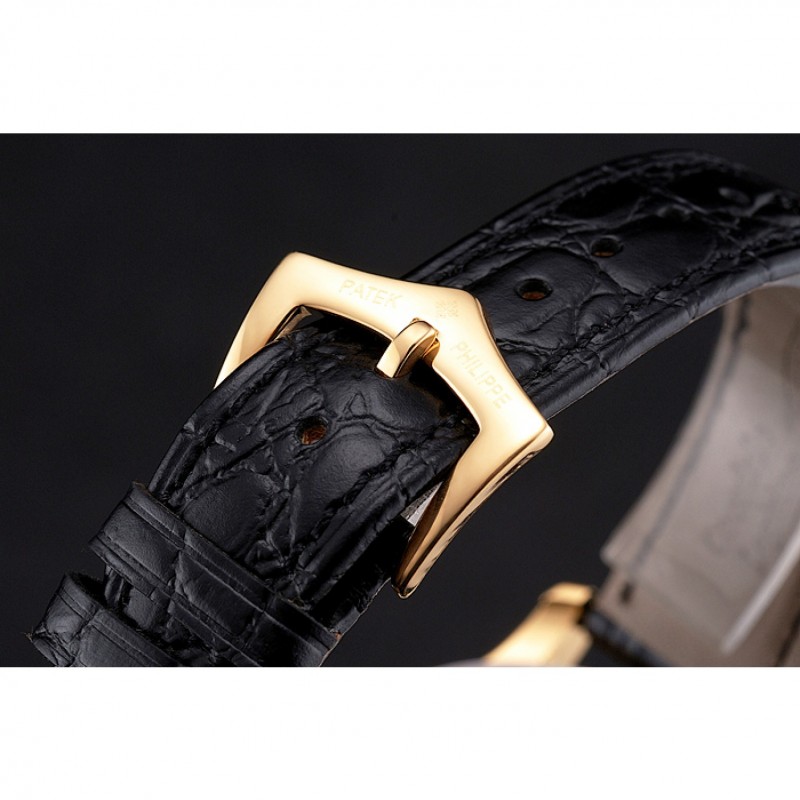 pulsera: Patek Philippe y logo correa de piel de cocodrilo negro en relieve de calor con Patek Philippe y el logotipo inscrito 18k oro amarillo plateado gancho hebilla de cierre