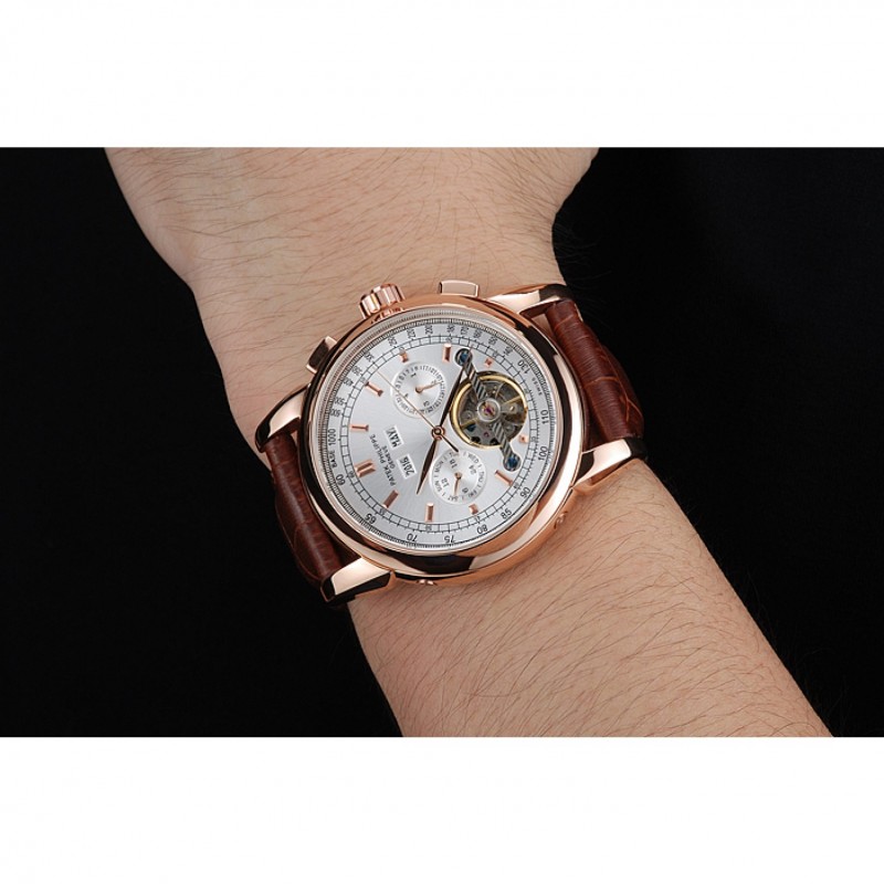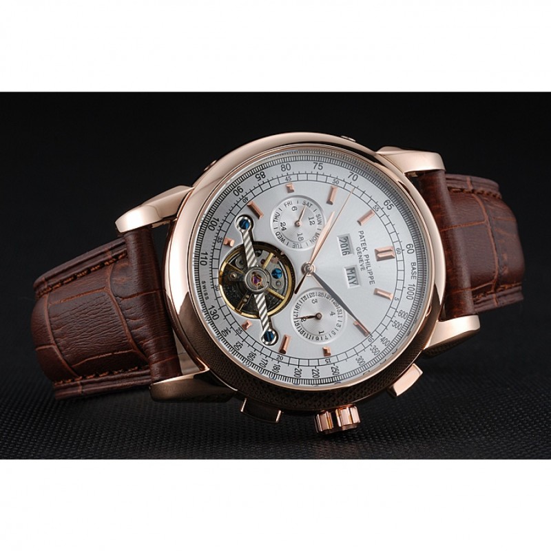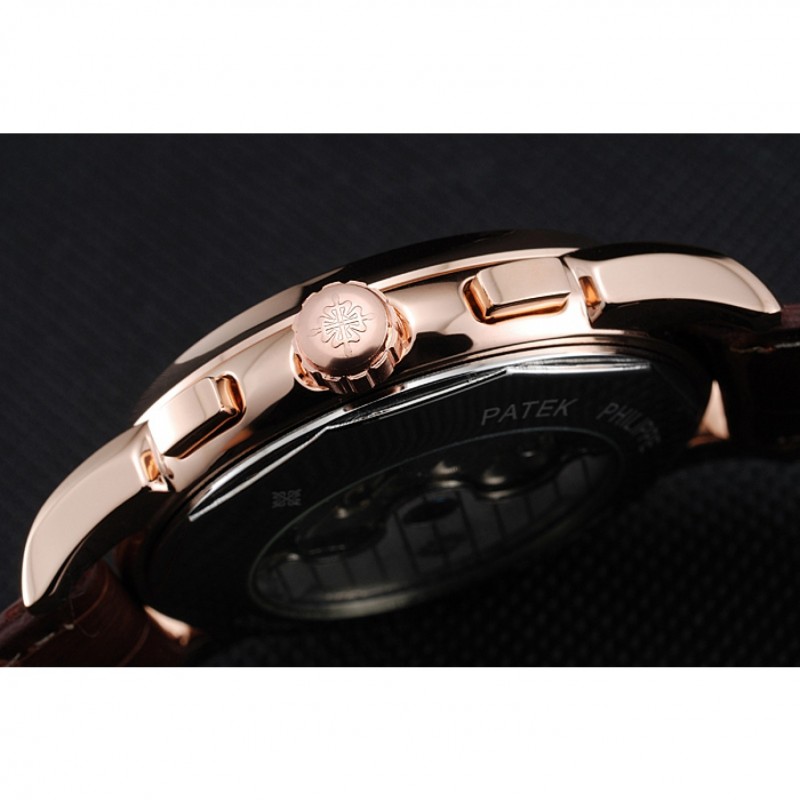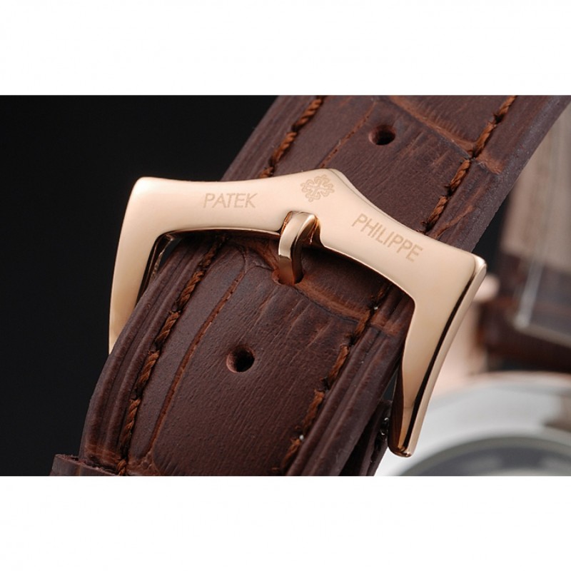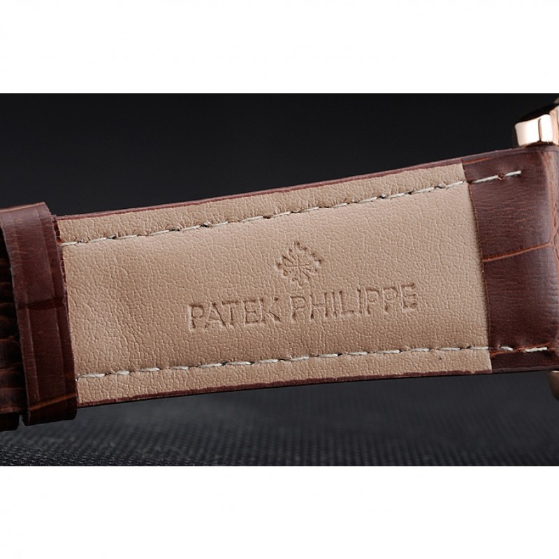 pulsera: Logo y correa de piel de cocodrilo marrón en relieve calor Patek Philippe Geneve rosa de 18 quilates chapado en oro de gancho hebilla de cierre